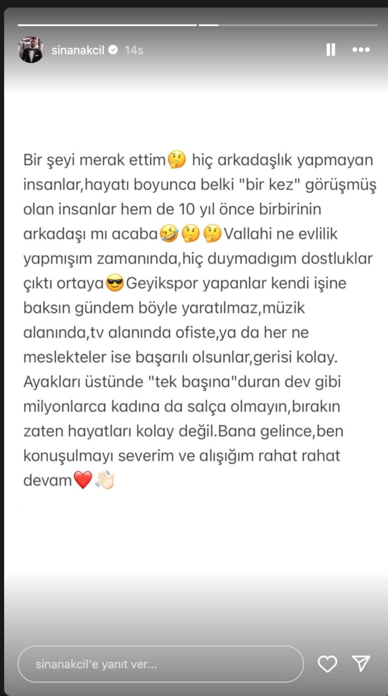 Erken ayrıca Sinan Akçıl olduğunu herkesin anladığı bir kareye de kalp emojisiyle paylaşmayı tercih etti.