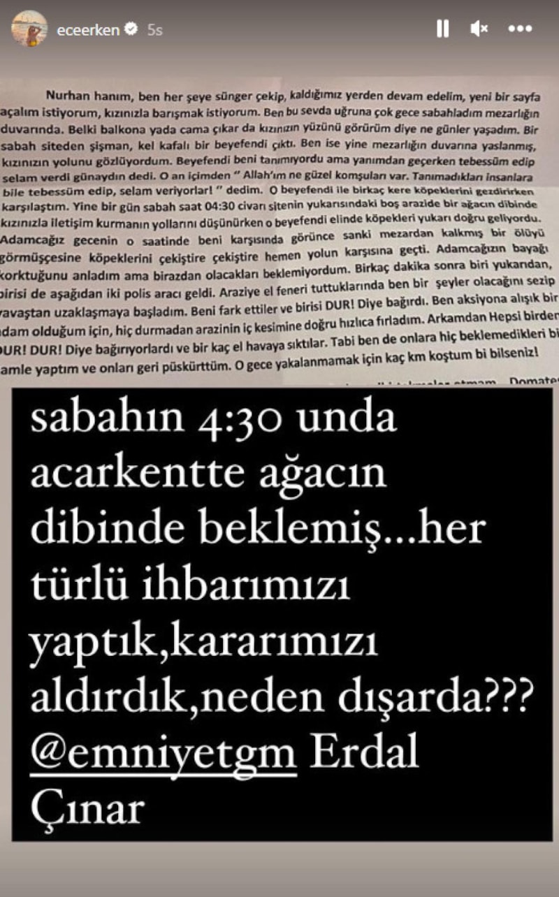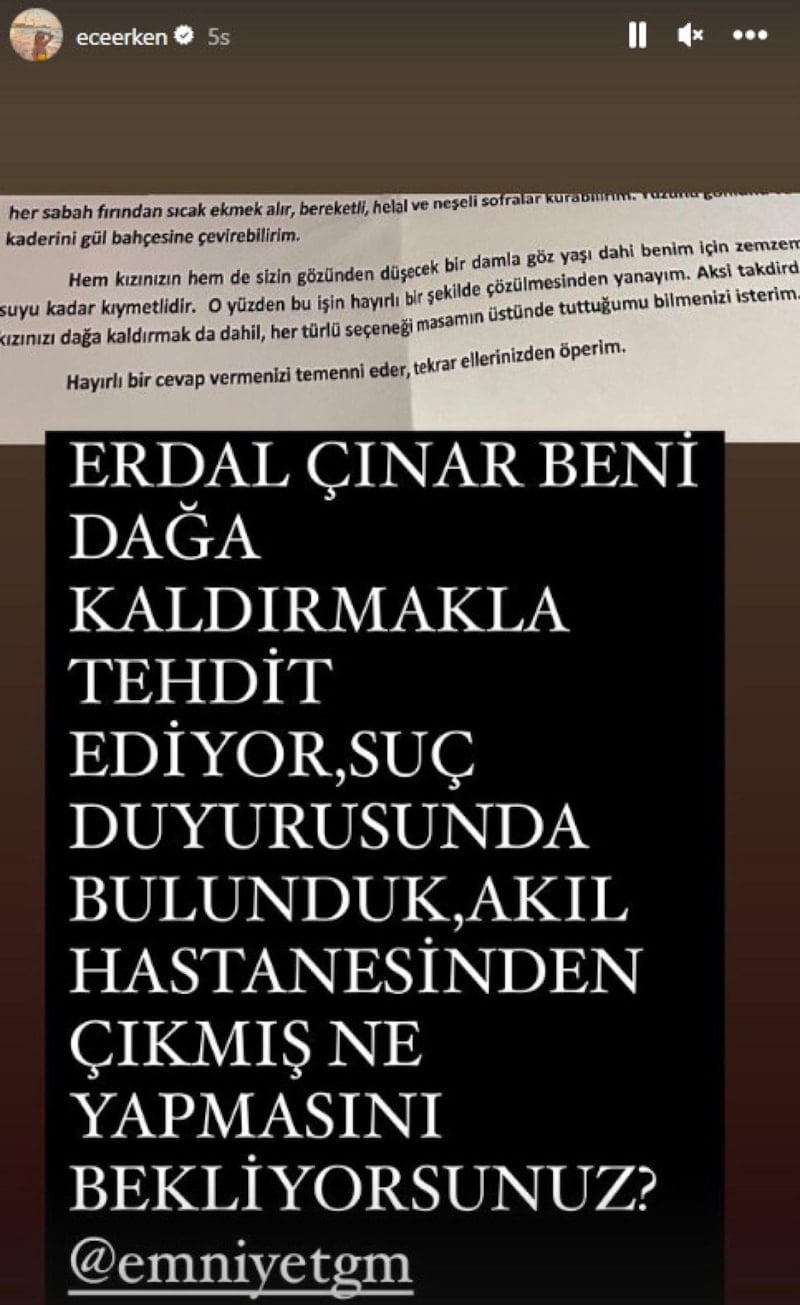 Erdal Çınar'ın annesine gönderdiği notları da emniyeti etiketleyerek paylaşan Ece Erken, "Erdal Çınar beni dağa kaldırmakla tehdit ediyor. Suç duyurusunda bulunduk. Akıl hastanesinden çıkmış ne yapmasını bekliyorsunuz?" ifadelerini kullandı.