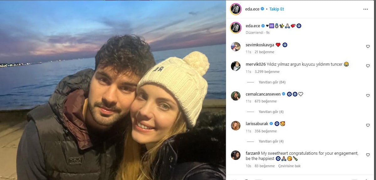 Ünlü oyuncu, Tuncer ile yayınladığı fotoğrafa kalp, nazar boncuğu ve sonsuzluk işareti koydu. Ece'nin fotoğrafına takipçilerinden beğeni ve yorum yağdı.
