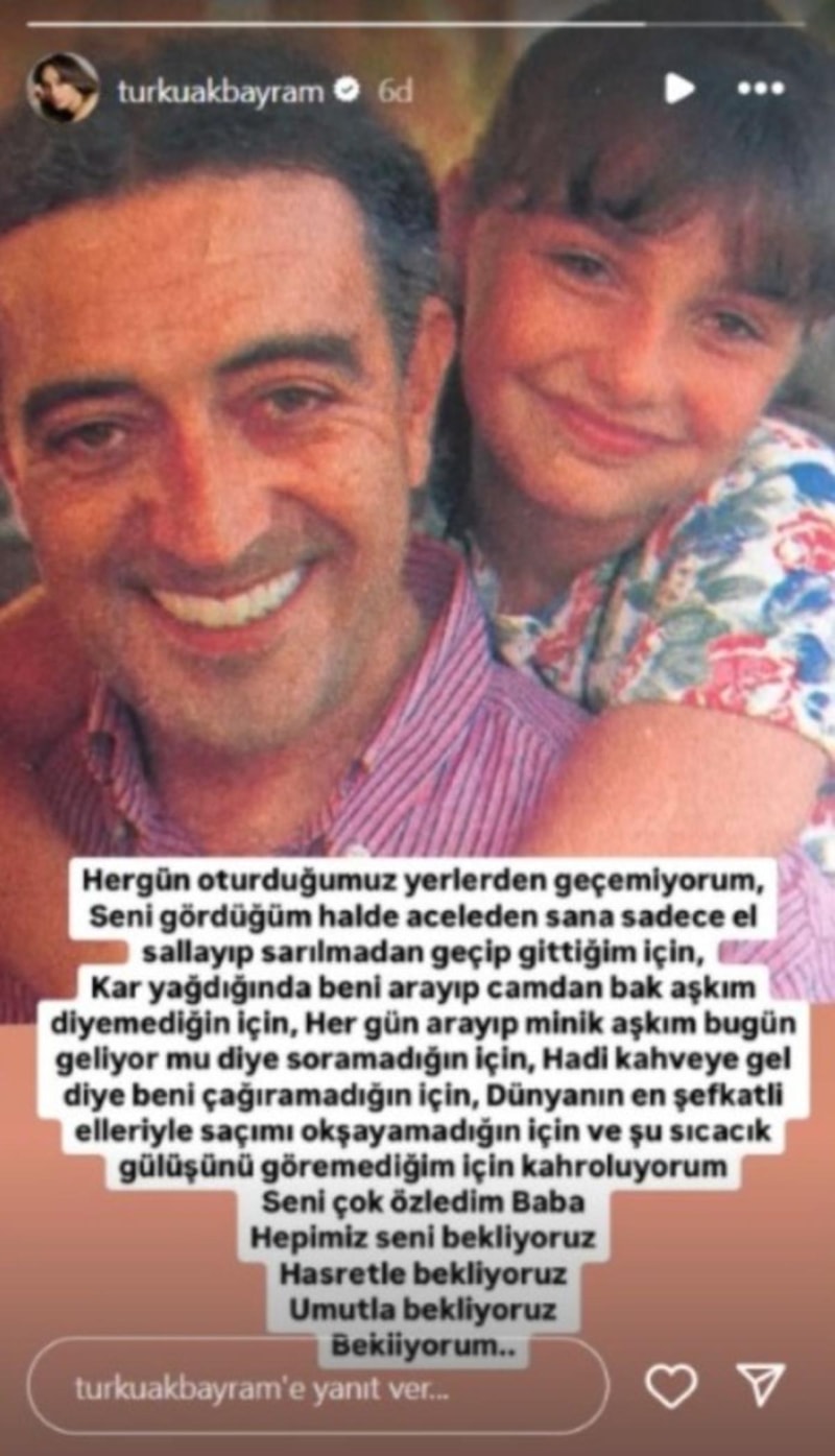 Sanatçının kızı Türkü Akbayram, sosyal medya hesabından babasıyla olan çocukluk fotoğrafını paylaşarak, babasına duyduğu özlemi dile getirdi.