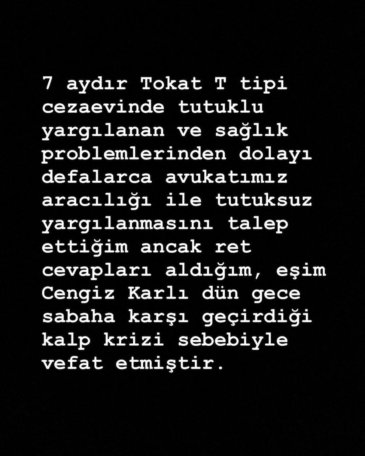 Zor zamanlar geçiren şarkıcı Elif Karlı, geçtiğimiz ay Cengiz Karlı ile evlilik yıl dönümlerini duygusal bir paylaşımla kutlamıştı. Eşine özlemini dile getiren Elif Karlı'dan, son olarak sitem dolu bir paylaşım geldi. Eşinin hasta olduğunu ve 6 aydır cezaevinde olduğunu söyleyen Elif Karlı, "Söz meclisten, gerçek dostlarımızdan dışarı" diyerek veryansın etmişti: