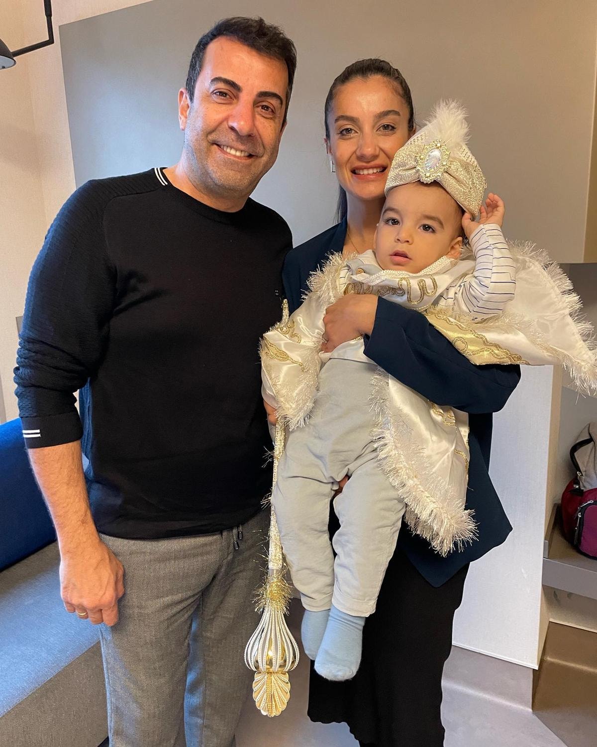 Oğlunun sünnet olduğunu duyuran oyuncu, aile pozlarına, "Oldu da bitti maşallah. Adam olur inşallah." mesajını yazdı.