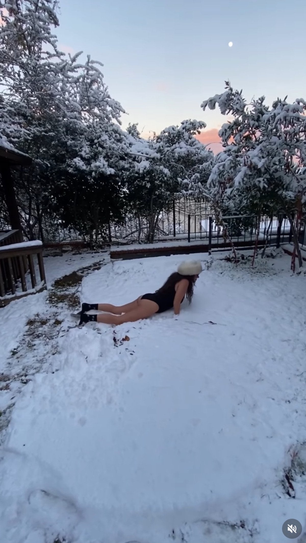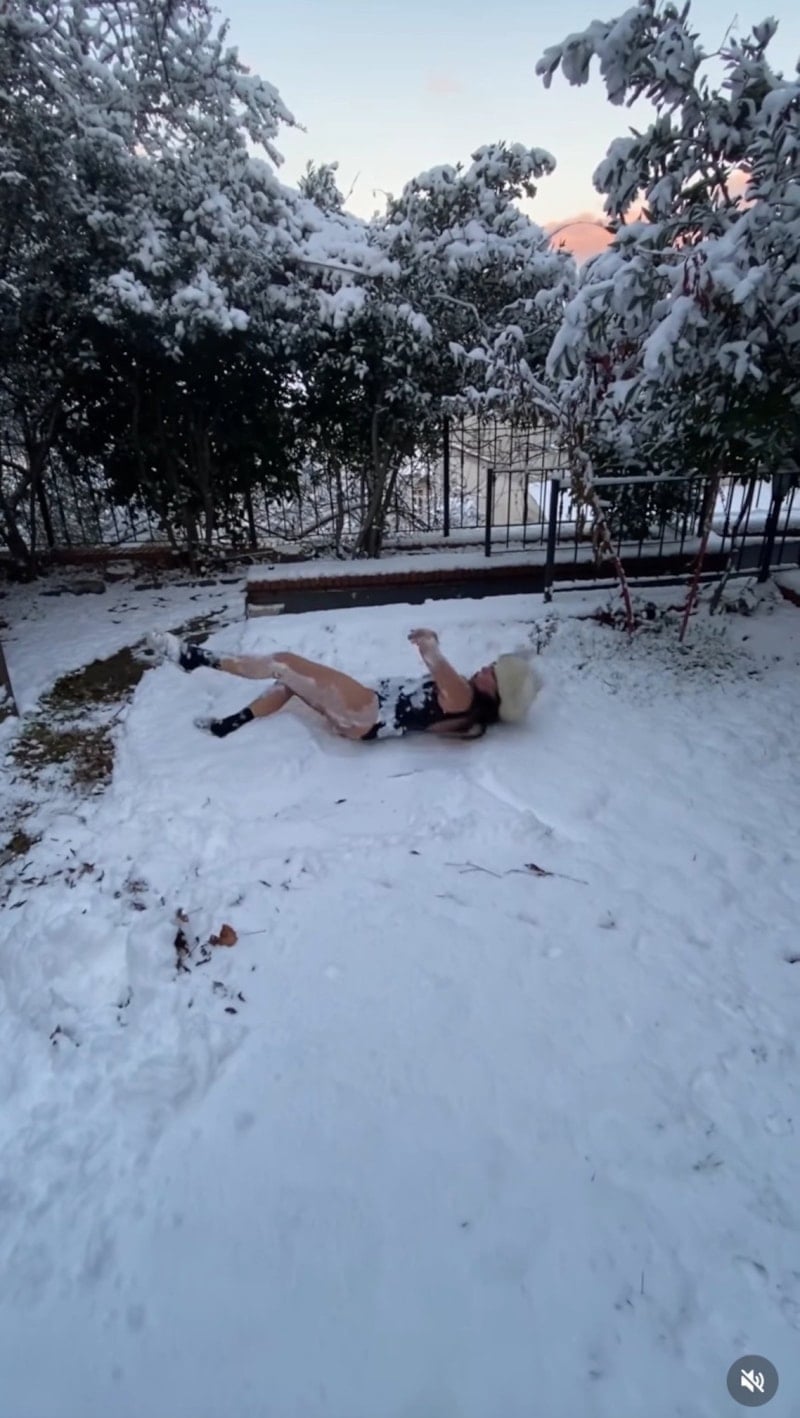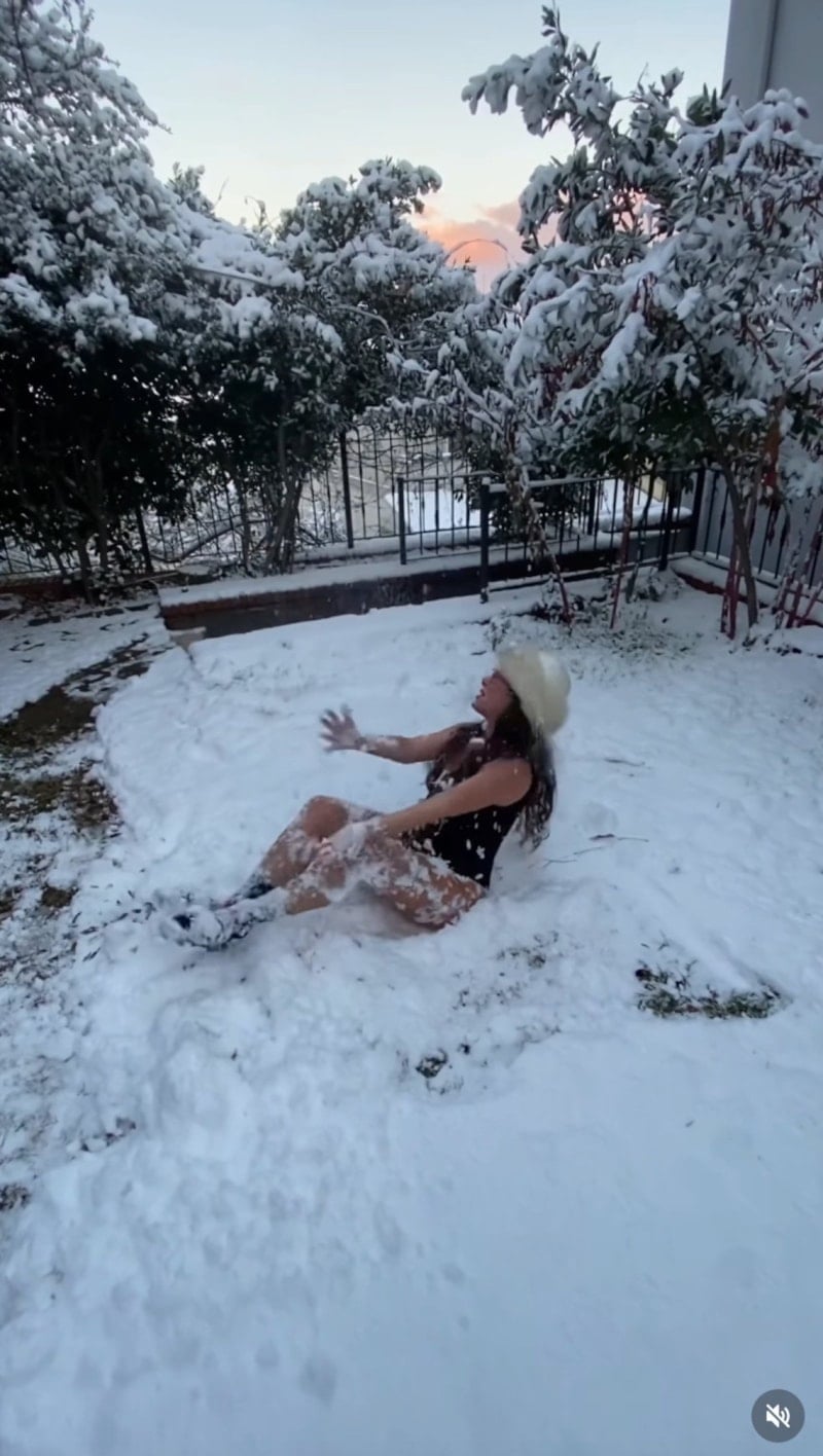Yeni yılı karla karşılayan Zeynep Özyağcılar, dayanamayıp karlar üzerinde yuvarlandı.