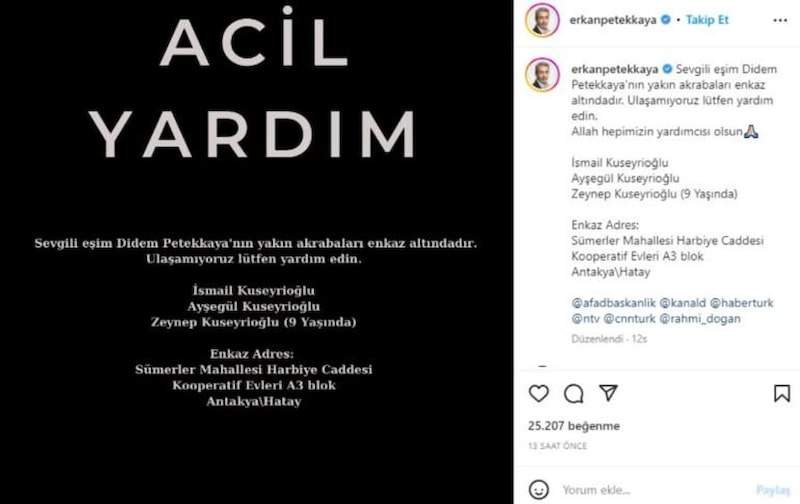 “Sevgili eşim Didem Petekkaya'nın yakın akrabaları enkaz altındadır. Ulaşamıyoruz lütfen yardım edin. Allah hepimizin yardımcısı olsun."