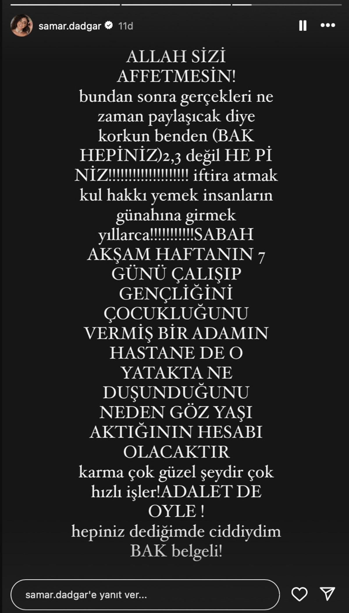 Eşinin hastanelik olmasının hesabını aileye kesen Dadgar, oldukça sert ifadelere yer verdiği hikayeleri peş peşe paylaştı.