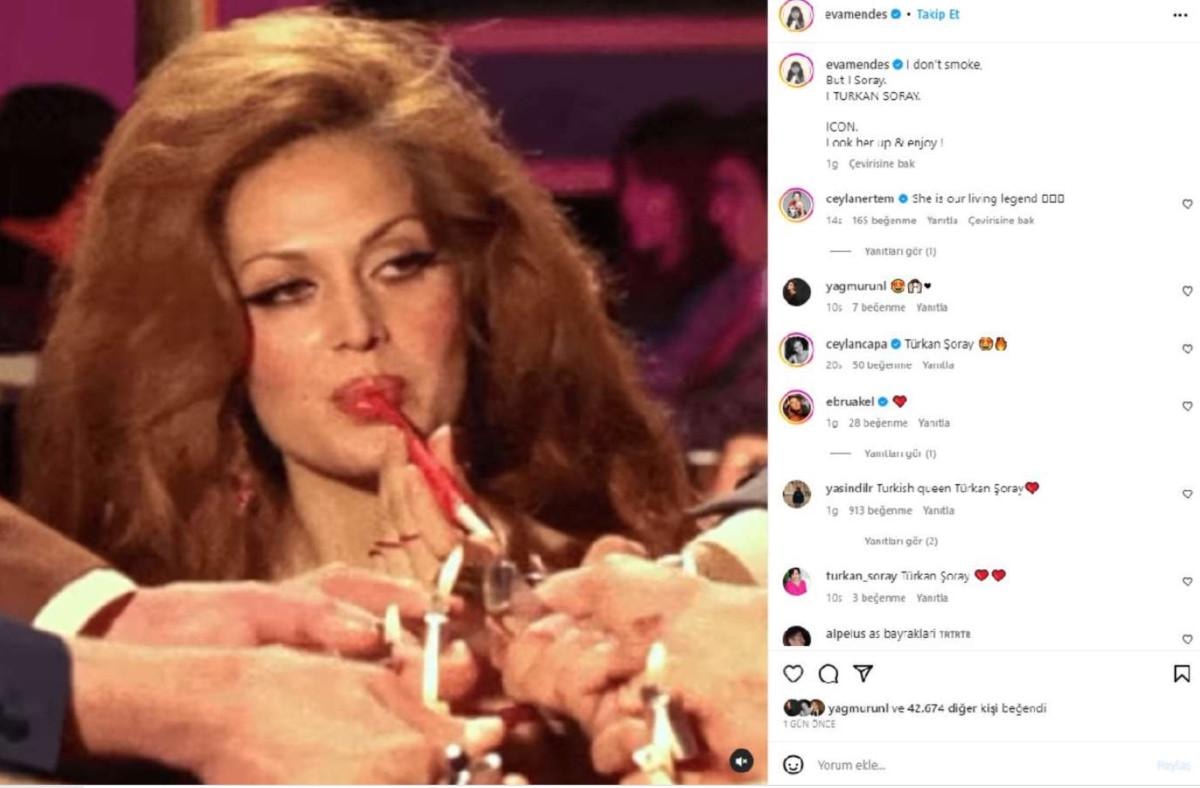 Mendes, Türkan Şoray'ın Cüneyt Arkın'la başrolü paylaştığı 1970 yapımı 'Arım, Balım, Peteğim' filminden alınan görüntünün altına, "Sigara içmiyorum ama Türkan Şoray bir ikon. Ona bakın ve keyiflenin" notunu düştü.