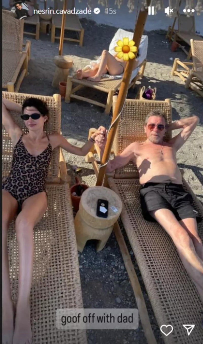 Plajda çıplak pozlar veren ve eleştiriler sonrası eve kapanan Nesrin Cavadzade, sosyal medya hesabına babasıyla verdiği pozları ekledi.