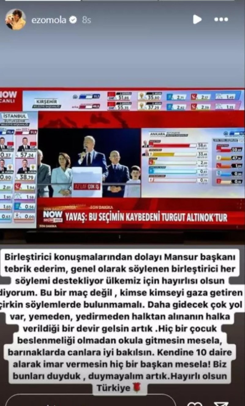 İkinci kez Ankara Büyükşehir Belediyesi Başkanı seçilen Mansur Yavaş'ın konuşması büyük beğeni aldı. Oyuncu Ezgi Mola da paylaşım yaparak AK Parti adayına göndermede bulundu.