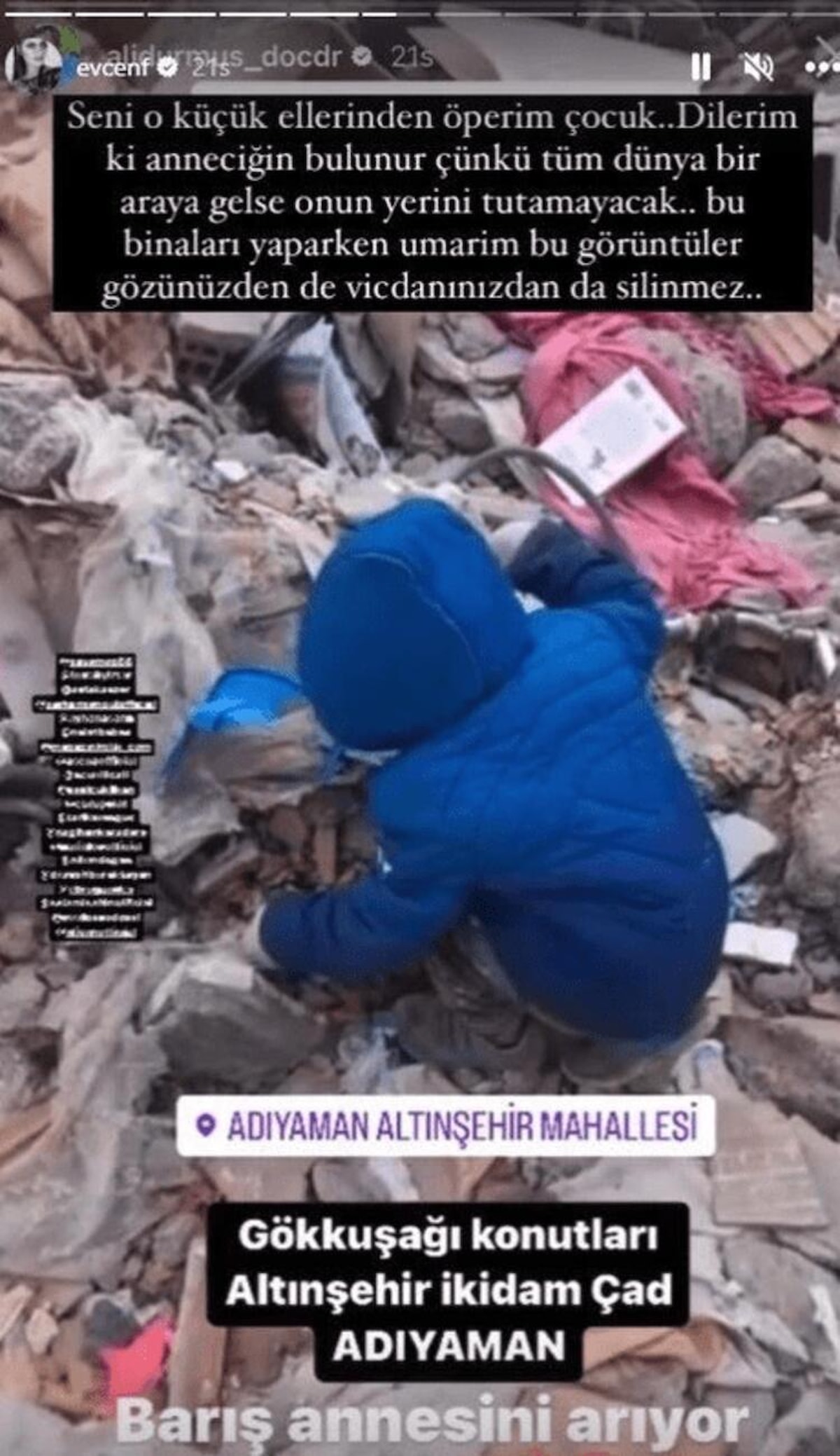 Adıyaman'da enkazların arasında annesini arayan küçük Barış'ı storysinde paylaşan Evcen, yazdığı duygu yüklü mesajla herkesi hüzünlendirdi: