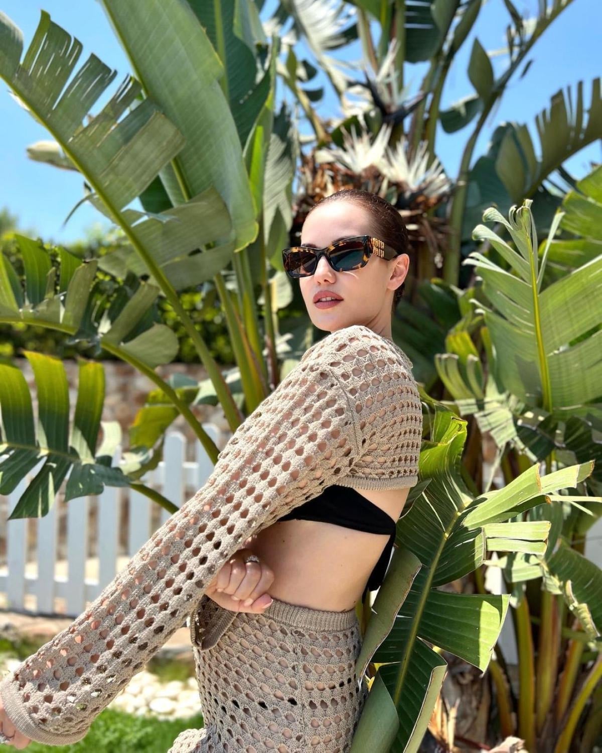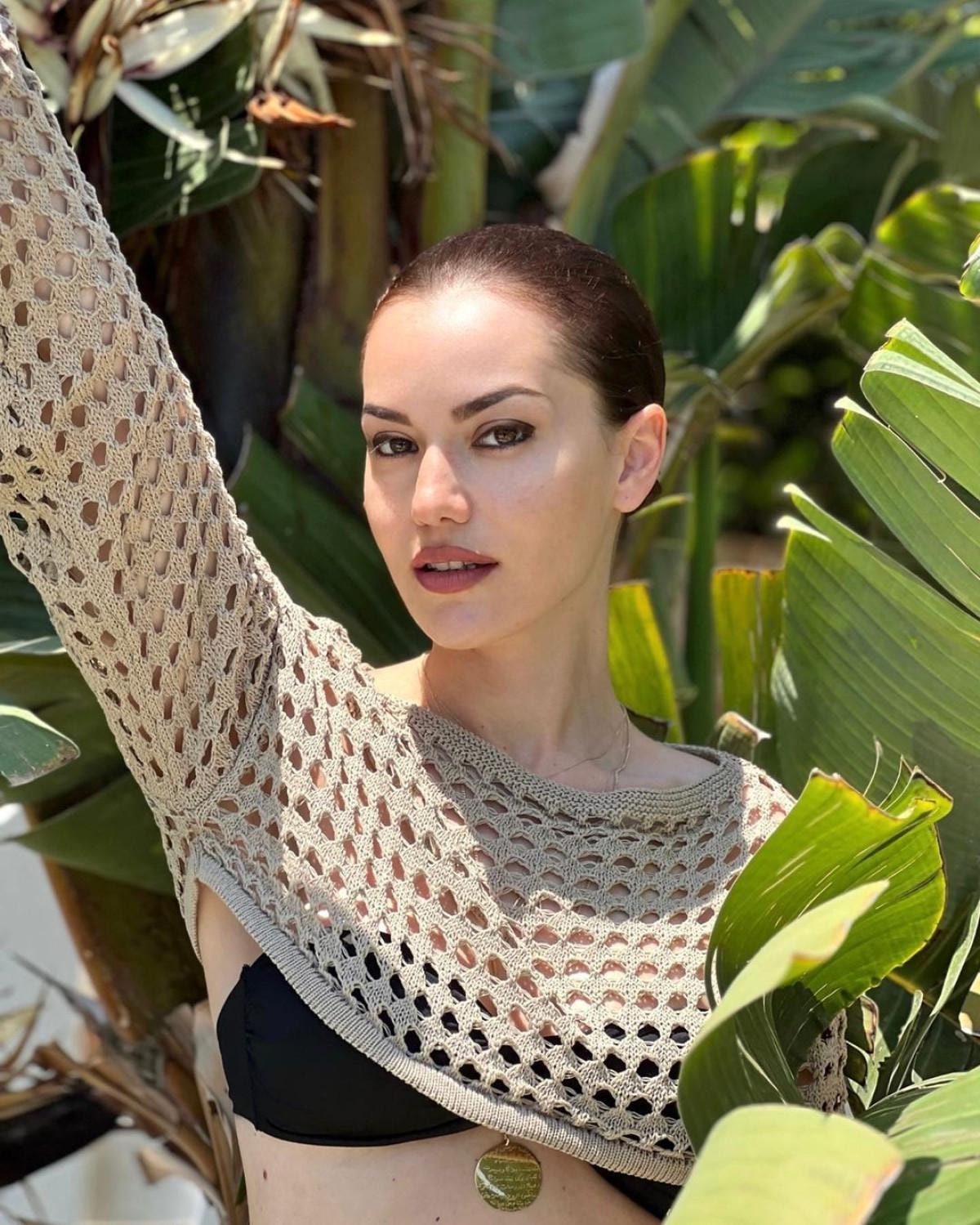 Siyah bikinisinin üstüne bej renginde bir plaj kıyafeti tercih eden Evcen, bir ağacın dallarının arasında objektif karşısına geçti.