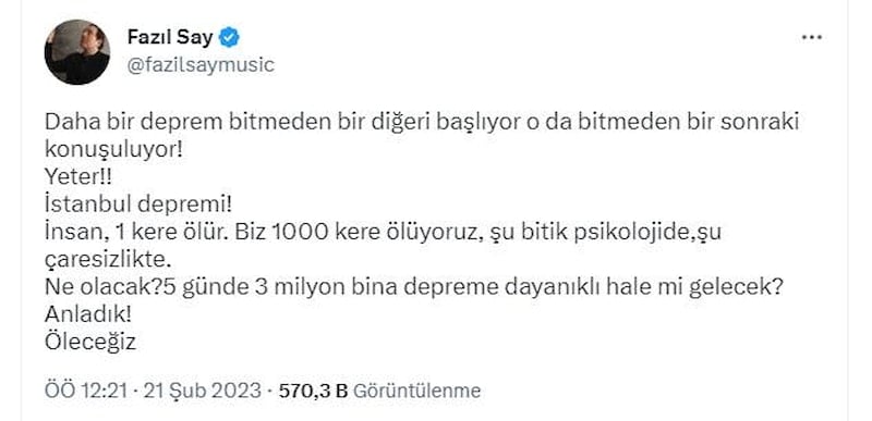 Ünlü piyanist Fazıl Say, Kahramanmaaş depremlerinden sonra sürekli İstanbul depremi uyarılarının yapılmasına isyan etti.