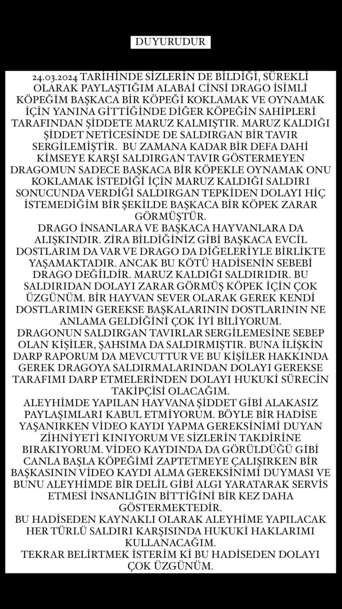"24.03.2024 tarihinde sizlerin de bildiği, sürekli olarak paylaştığım alabai cinsi Drago isimli köpeğim başkaca bir köpeği koklamak ve oynamak için yanına gittiğinde diğer köpeğin sahipleri tarafından şiddete maruz kalmıştır. Maruz kaldığı şiddet neticesinde de saldırgan bir tavır sergilemiştir. Bu zamana kadar bir defa dahi kimseye karşı saldırgan tavır göstermeyen Drago'mun sadece başkaca bir köpekle oynamak onu koklamak istediği için maruz kaldığı saldırı sonucunda verdiği saldırgan tepkiden dolayı hiç istemediğim bir şekilde başkaca bir köpek zarar görmüştür. Drago insanlara ve başkaca hayvanlara da alışkındır. Zira bildiğiniz gibi başkaca evcil dostlarım da var ve Drago da diğerleriyle birlikte yaşamaktadır. Ancak bu kötü hadisenin sebebi Drago değildir. Maruz kaldığı saldırıdır.