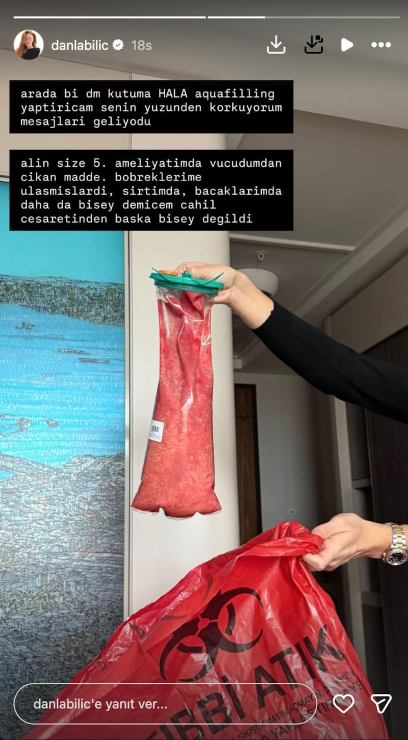 Ünlü isim; 'Arada bir dm kutuma hala aquafilling yaptıracağım, senin yüzünden korkuyorum mesajları geliyordu. Alın size 5. ameliyatımda vücudumdan çıkan madde. Böbreklerime ulaşmışlardı, sırtımda, bacaklarımda daha da bir şey demeyeceğim, cahil cesaretinden başka bir şey değildi.' ifadelerini kullandı.