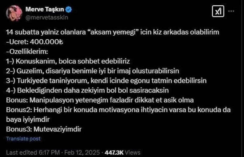 Sosyal medya hesabından yaptığı paylaşımında Sevgililer Günü'nde 400 bin TL karşılığı isteyenle 'akşam yemeği' yiyebileceğini belirten Taşkın, kısa sürede büyük tepki topladı..