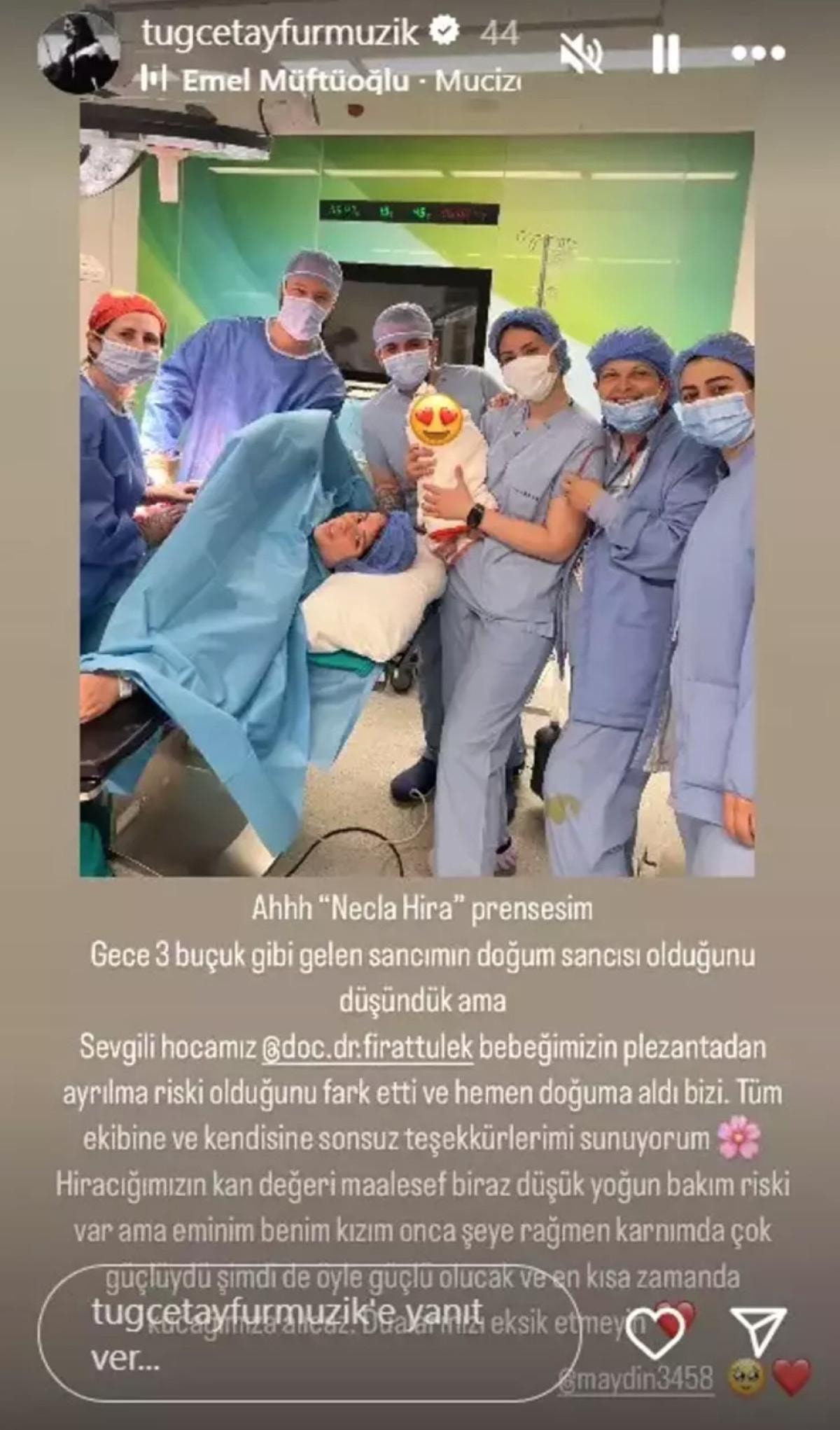 "Ah 'Necla Hira' prensesim. Gece 03.30 gibi gelen sancımın doğum sancısı olduğunu düşündük ama sevgili hocamız bebeğimiz plasentadan ayrılma riski olduğunu fark etti ve hemen doğuma aldı bizi. Tüm ekibine ve kendisine sonsuz teşekkürlerimi sunuyorum. Hiracığımızın kan değeri maalesef biraz düşük, yoğun bakım riski var ama eminim benim kızım onca şeye rağmen karnımda çok güçlüydü şimdi de öyle güçlü olacak. En kısa zamanda kucağımıza alacağız. Dualarınızı eksik etmeyin."