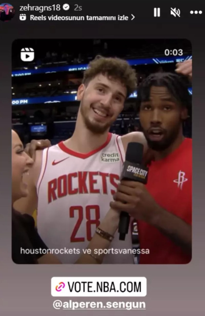 VakıfBank'ın ve Filenin Sultanları'nın yıldız orta oyuncusu Zehra Güneş, NBA'de Houston Rockets forması giyen Alperen Şengün'le ilgili sosyal medya hesabından bir paylaşım yaptı.