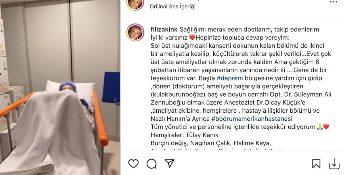 "Sol üst kulağımdaki kanserli dokunun kalan bölümü de ikinci bir ameliyatla kesilip, küçültülerek tekrar şekil verildi. Evet çok üst üste ameliyatlar olmak zorunda kaldım ama çektiğim 6 Şubat'tan itibaren yaşananların yanında nedir ki! Yine de bir teşekkürüm var. Başta deprem bölgesine yardım için gidip dönen ve ameliyatı başarıyla gerçekleştiren doktorum olmak üzere ameliyat ekibine, hemşirelere, hastayla ilişkiler bölümüne içtenlikle teşekkür ediyorum. Emeğinize sağlık. Tüm iyilik dilekleri için hepinize tüm kalbimle ayrı, ayrı teşekkür ediyorum."