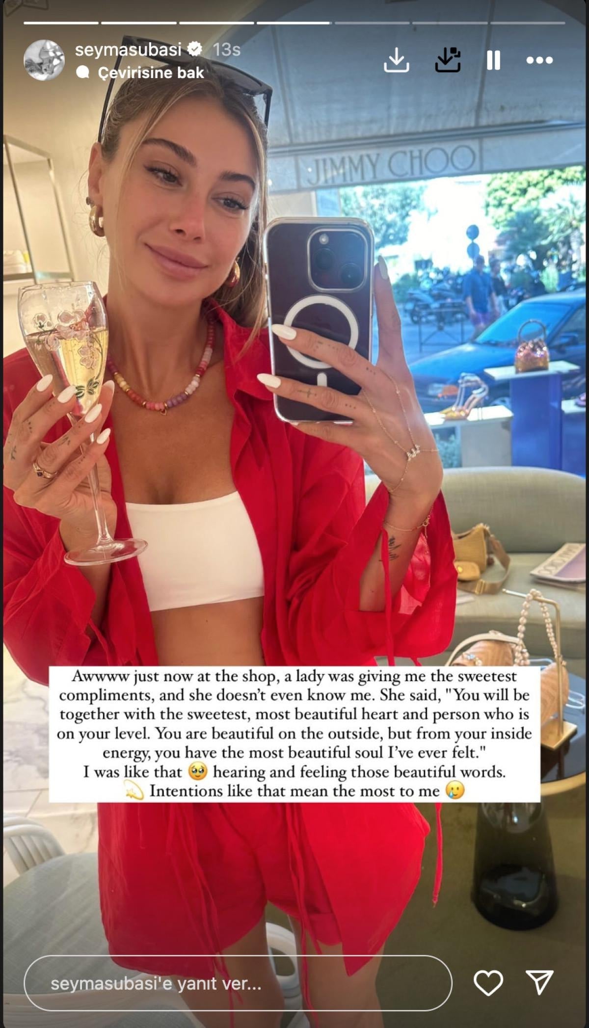 Şeyma Subaşı, paylaşımında "Tahmin edin ne oldu çocuklar? Yine aşık oldum. LOL. Ve neredeyse düşünüyordum... Acaba herhangi bir heyecan, herhangi bir yer veya herhangi bir insan olacak mı? Ve ne oldu biliyor musunuz? Evet. Hala hissedecek çok şey var. En tatlı zaman her yerde hissediyorum." dedi.