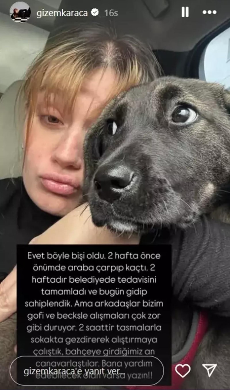 Ancak evinde 2 köpeği daha bulunan Gizem Karaca, sosyal medya hesabından yeni sahiplendiği köpeğini paylaşarak şu ifadeleri kullandı: "Evet böyle bir şey oldu. 2 hafta önce önümde araba çarpıp kaçtı. 2 haftadır belediyede tedavisini tamamladı ve bugün gidip sahiplendik.