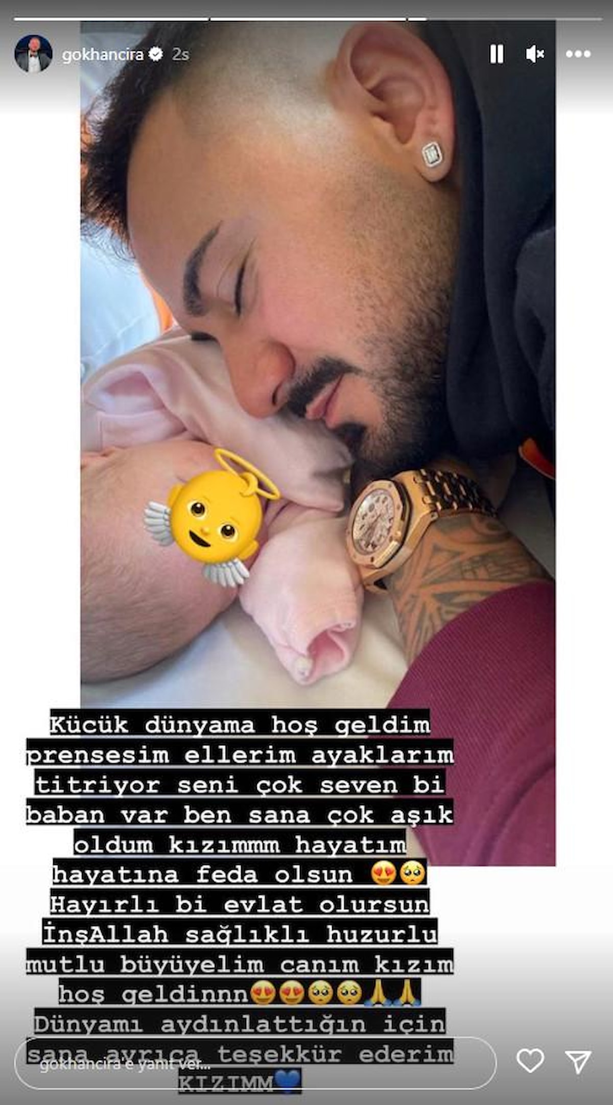 Küçük dünyama hoş geldin prensesim. Ellerim ayaklarım titriyor seni çok seven bir baban var. Ben sana çok aşık oldum kızım. Hayatım hayatına feda olsun. Hayırlı bir evlat olursun inşallah. Sağlıklı, mutlu, huzurlu büyüyelim canım kızım, hoş geldin. Dünyamı aydınlattığın için sana ayrıca teşekkür ederim kızım.