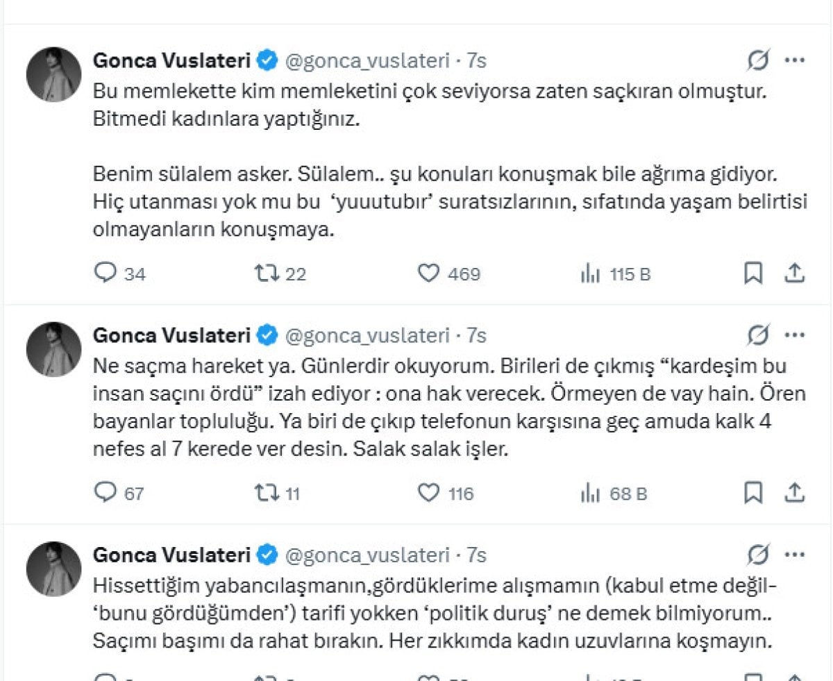 Kadınlar üzerinden yürütülen kampanyalara karşı olduğunu vurgulayan Vuslateri, “Bu memlekette kim memleketini çok seviyorsa zaten saçkıran olmuştur. Bitmedi kadınlara yaptığınız.” ifadelerini kullandı.