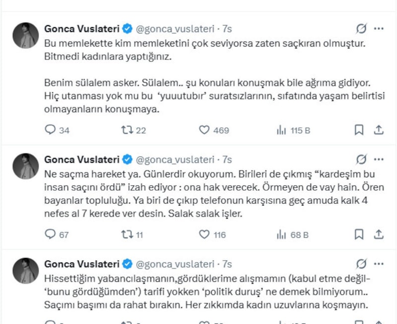 Suriye'de yaşananlara tepki olarak DEM Partililerin başlattığı saç örme akımı sosyal medyada kısa sürede gündem oldu. Ünlü oyuncu Gonca Vuslateri ise paylaşımlara çok sert tepki verdi.