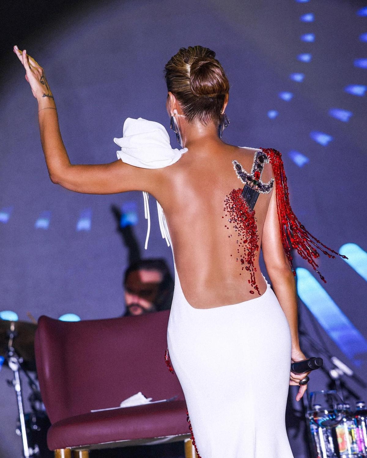 Sırt dekoltesinde hançer desenli beyaz bir elbise giyen Gülben Ergen, sosyal medyada gündem oldu.