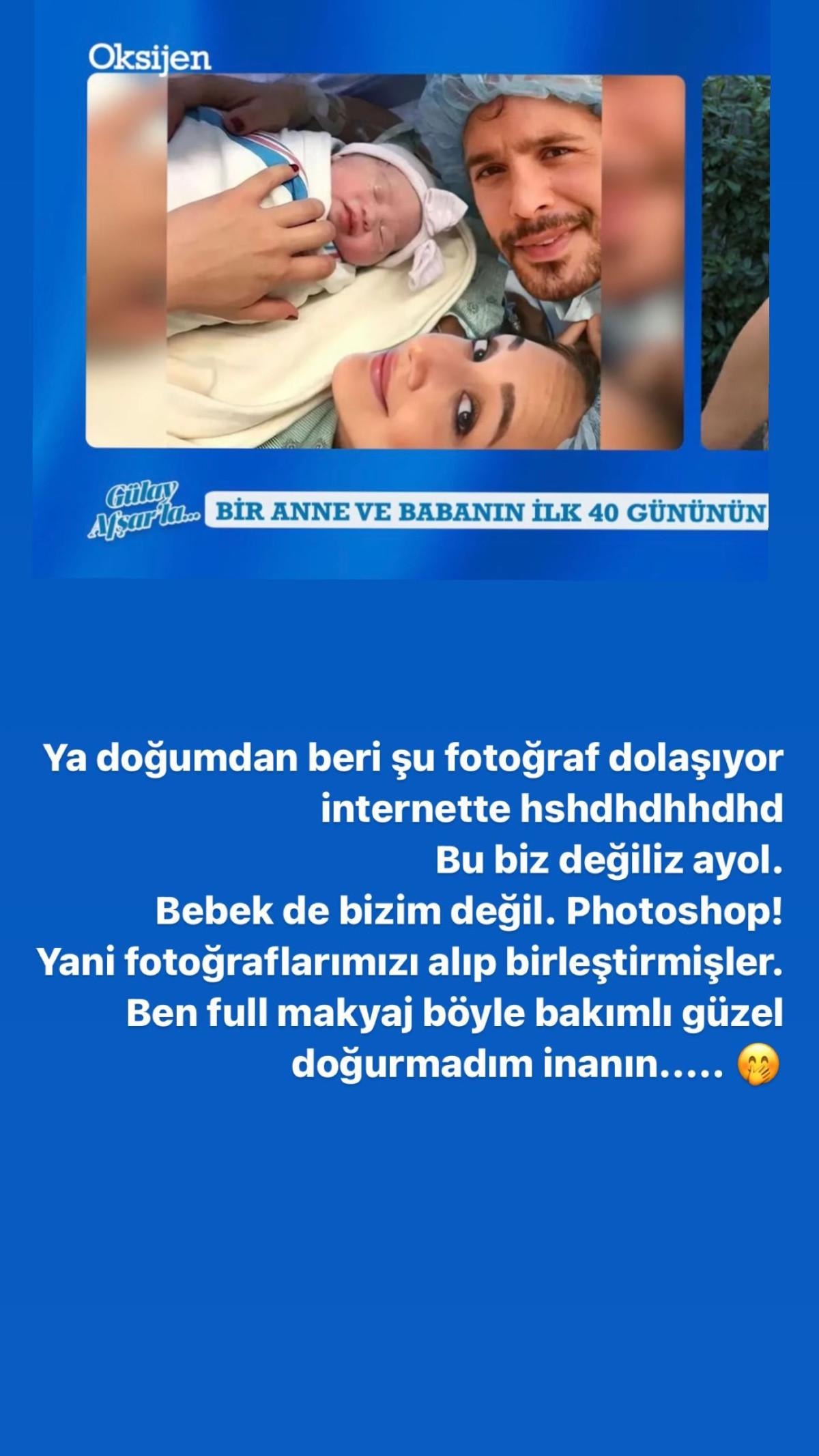 Fotoğrafı paylaşan ünlü isim, "Doğumdan beri şu fotoğraf dolaşıyor internette. Bu biz değiliz. Bebek de bizim değil. Photoshop! Yeni fotoğraflarımızı alıp birleştirmişler! Ben full makyaj böyle bakımlı güzel doğurmadım inanın." notunu ekledi.