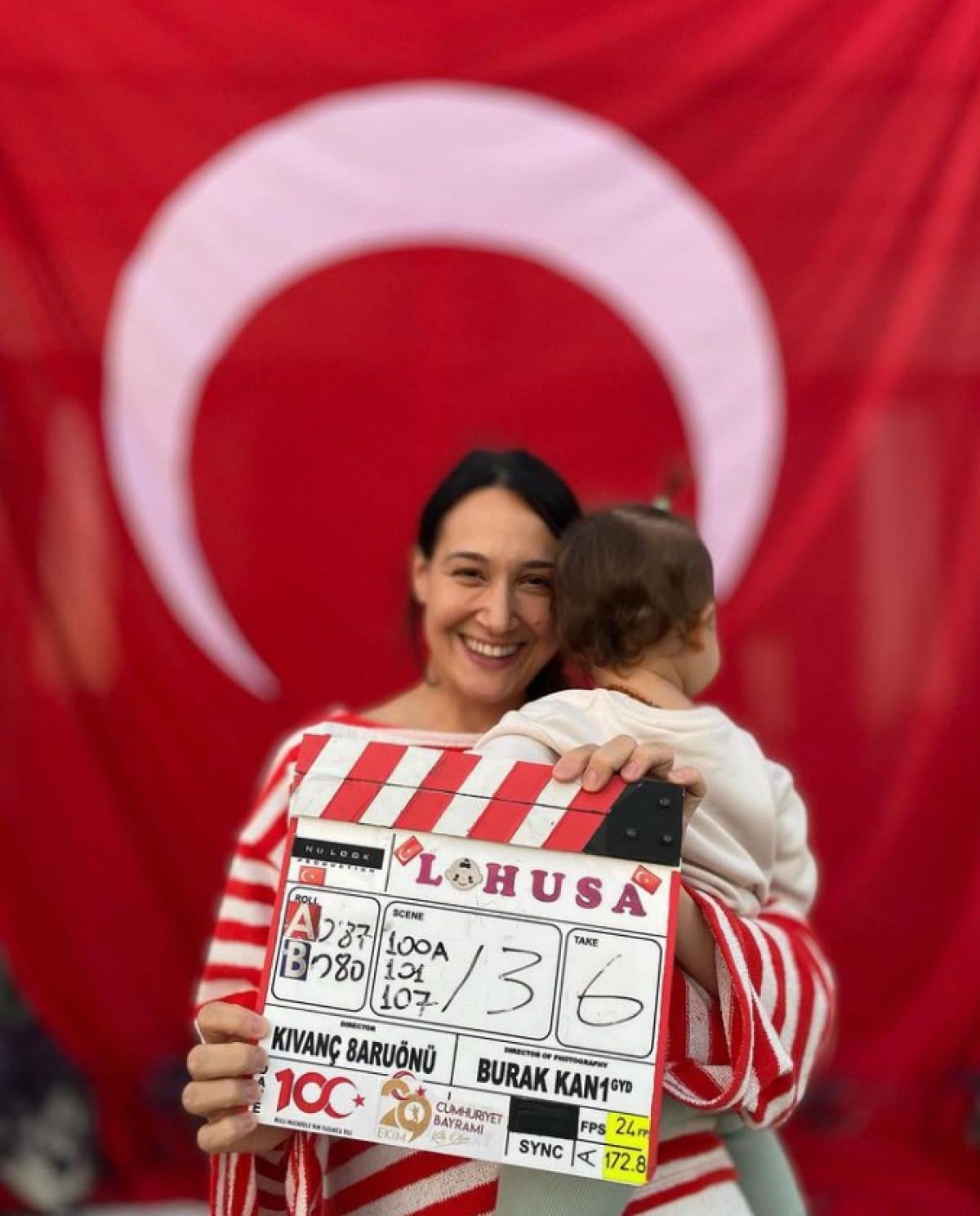 Kızını sete götürdüğü anlardan birisinde fotoğraf çektiren Özay, Cumhuriyet'in 100. yılını unutmadı.