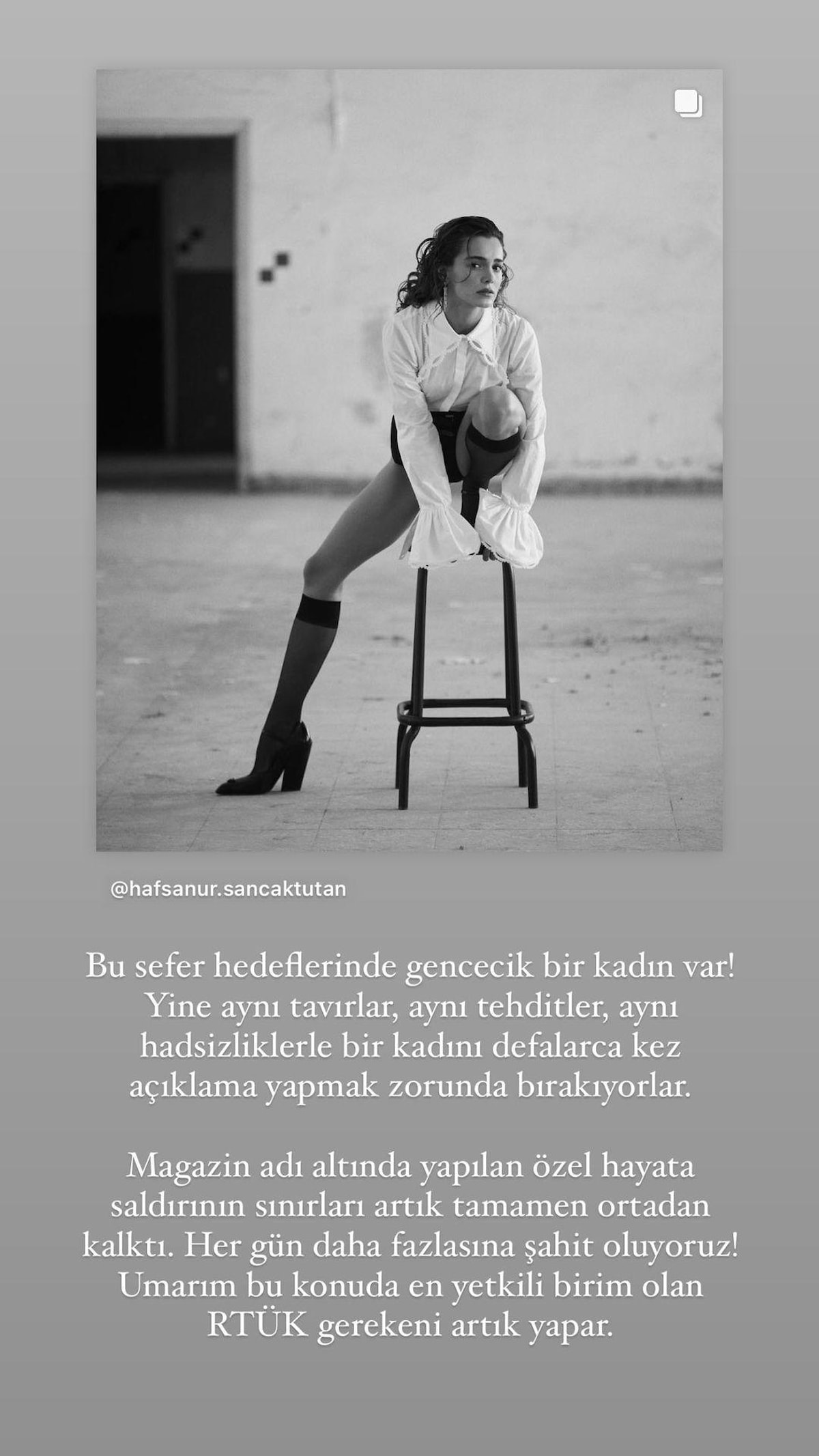 Sosyal medyada açıklama yapan Hadise, şu ifadeleri kullandı: "Bu sefer de hedeflerinde gencecik bir kadın var! Yine aynı tavırlar, aynı tehditler, aynı hadsizliklerle bir kadını defalarca kez açıklama yapmak zorunda bırakıyorlar. Magazin adı altında yapılan özel hayata saldırının sınırları artık tamamen ortadan kalktı. Her gün daha fazlasına şahit oluyoruz! Umarım bu konuda en yetkili birim olan RTÜK gerekeni yapar".