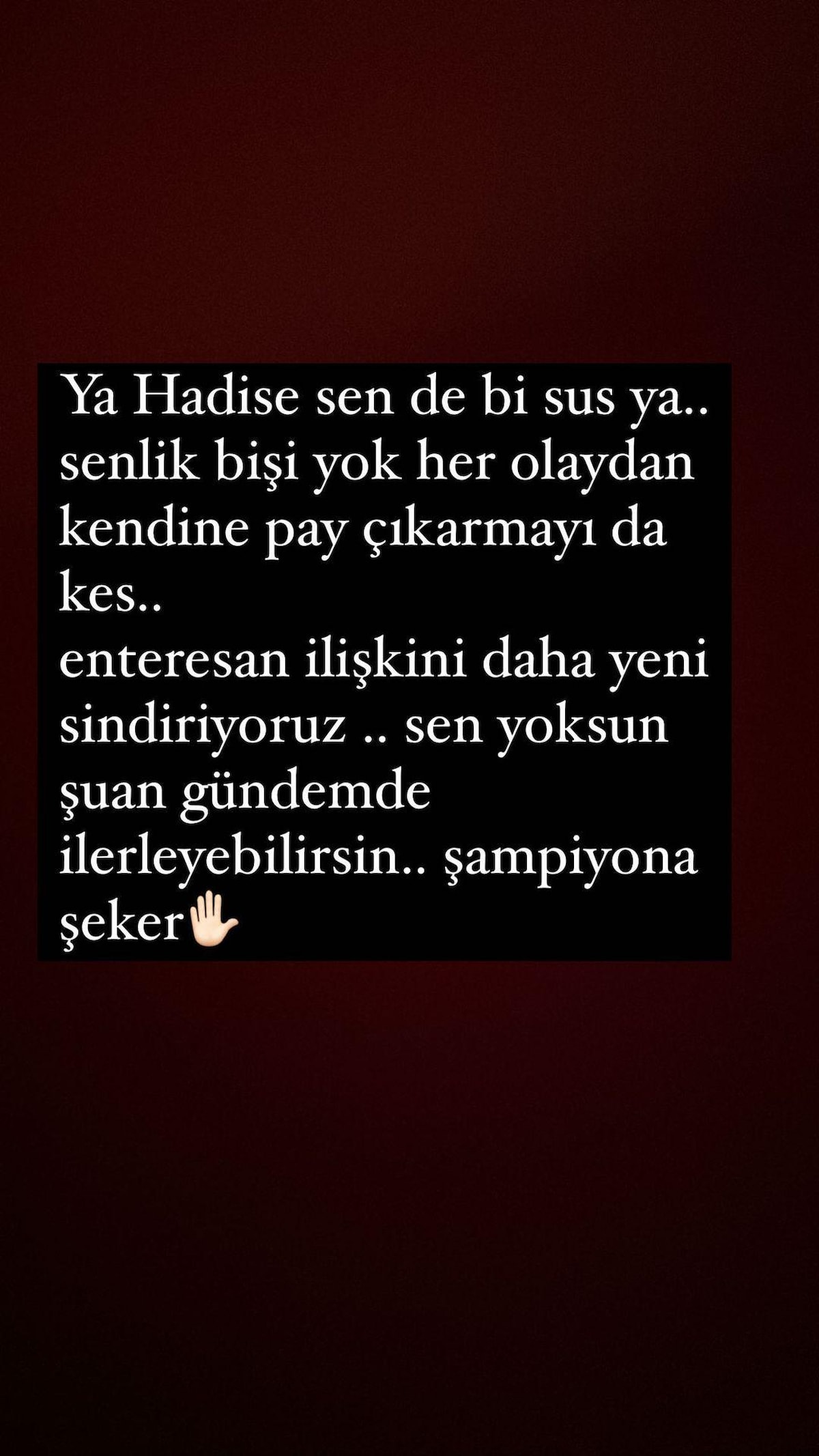 Instagram sayfasında Hadise'ye yanıt veren Bircan Bali, şunları söyledi: "Ya Hadise sen de bir sus ya... Senlik bir şey yok, her olaydan kendine pay çıkarmayı da kes... Enteresan ilişkini daha yeni sindiriyoruz. Sen yoksun şu an gündemde ilerleyebilirsin. Şampiyona şeker."