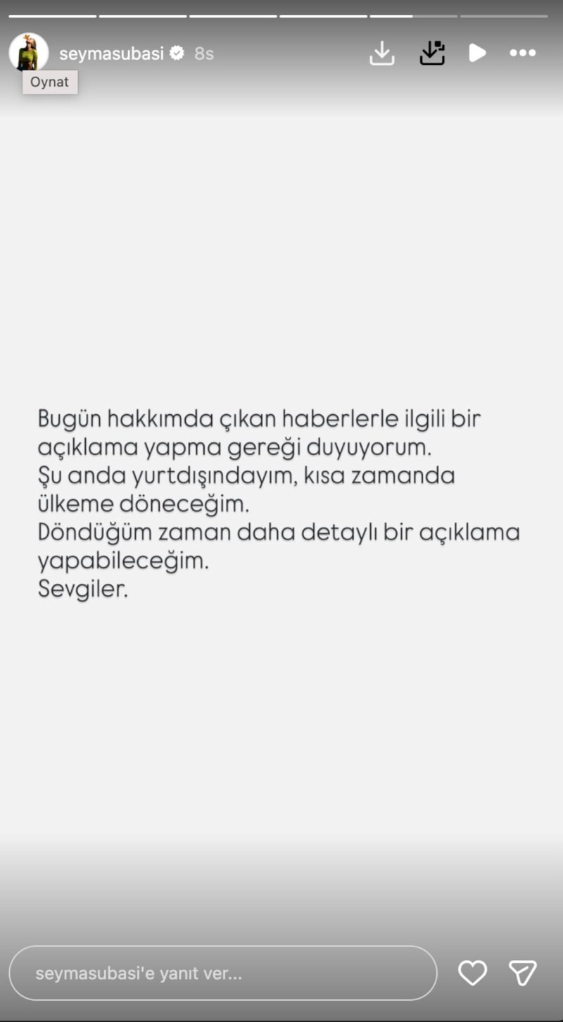 Subaşı, "Bugün hakkımda çıkan haberlerle ilgili bir açıklama yapma gereği duyuyorum. Şu anda yurt dışındayım. Kısa zamanda ülkeme döneceğim. Döndüğüm zaman daha detaylı bir açıklama yapabileceğim." dedi.