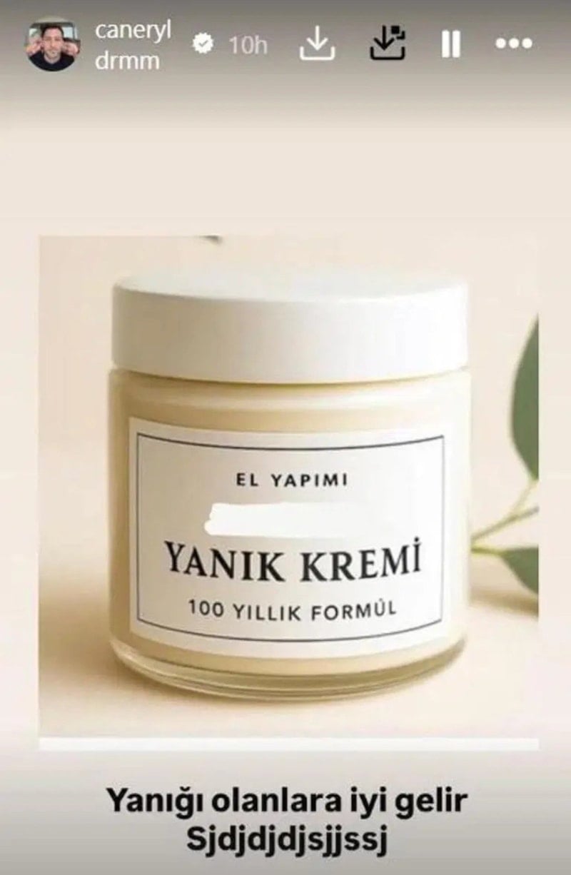 Ünlü ismin eşi Caner Yıldırım, daha sonra "yanık kremi" paylaşarak altına, 'Yanığı olanlara iyi gelir' yazdı.