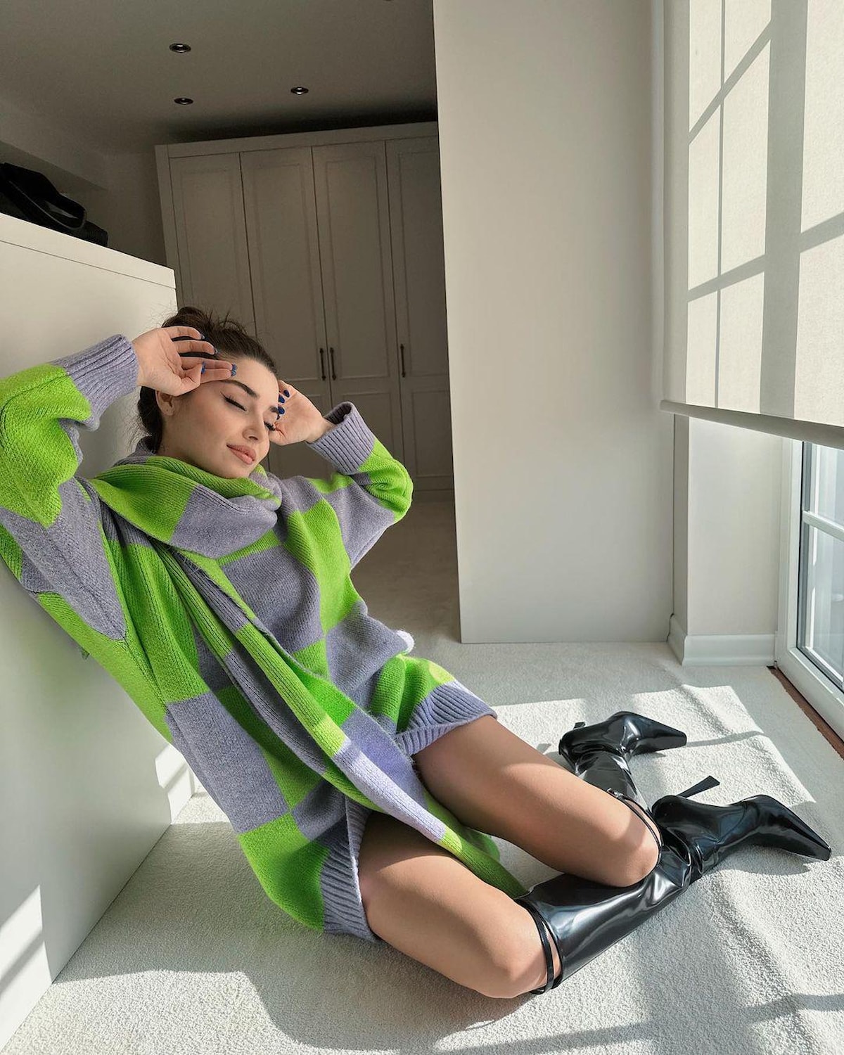 Yeşil-gri çizgili elbisesi ve siyah çizmeleriyle pencere önünde çekilen fotoğraflarını peş peşe yayınlayan Erçel, kısa sürede sosyal medyada gündem oldu.