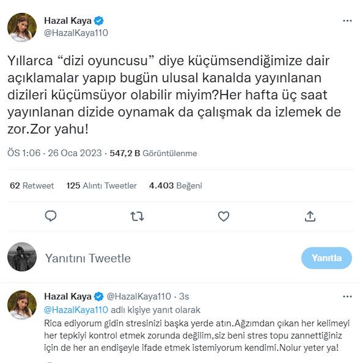 Eleştiriye ilk olarak, "Beybi sakin, 3 saate yakın dizi izlemek benim için çok zor sadece." sözleriyle yanıt veren Kaya, ardından uzun bir açıklama yaparak şu cümlelere yer verdi: