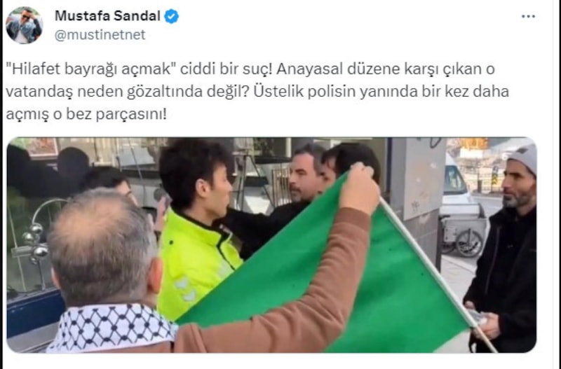 Sandal, "Hilafet bayrağı açmak' ciddi bir suç! Anayasal düzene karşı çıkan o vatandaş neden gözaltında değil? Üstelik polisin yanında bir kez daha açmış o bez parçasını!" ifadelerini kullandı.