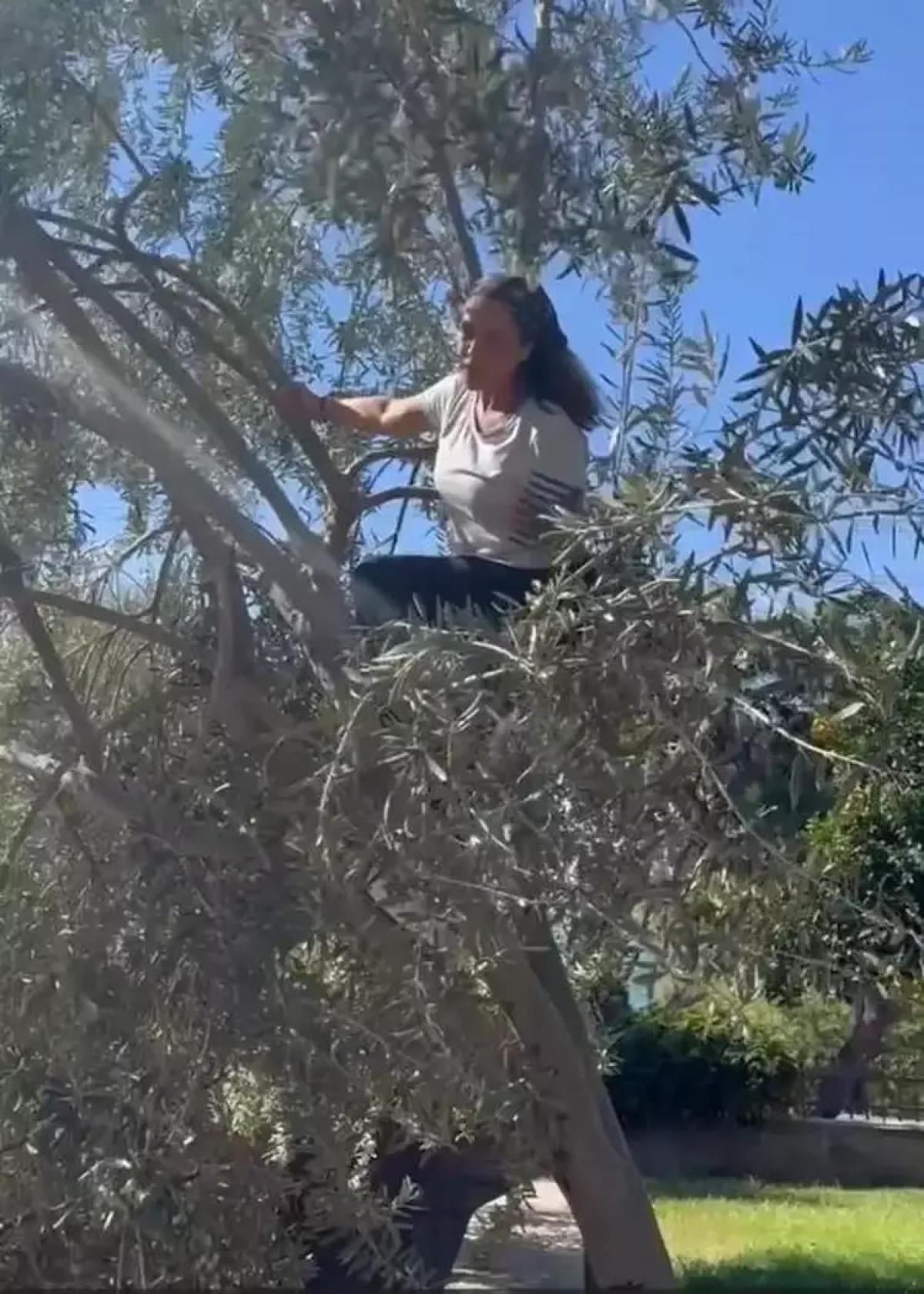 Hülya Avşar, bahçesindeki ağaca çıkarak zeytin hasadına başladı.