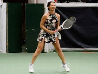 Taşlı ve çiçek desenli elbiseyle maç yapan Hülya Avşar, tek kadınlarda elendi.