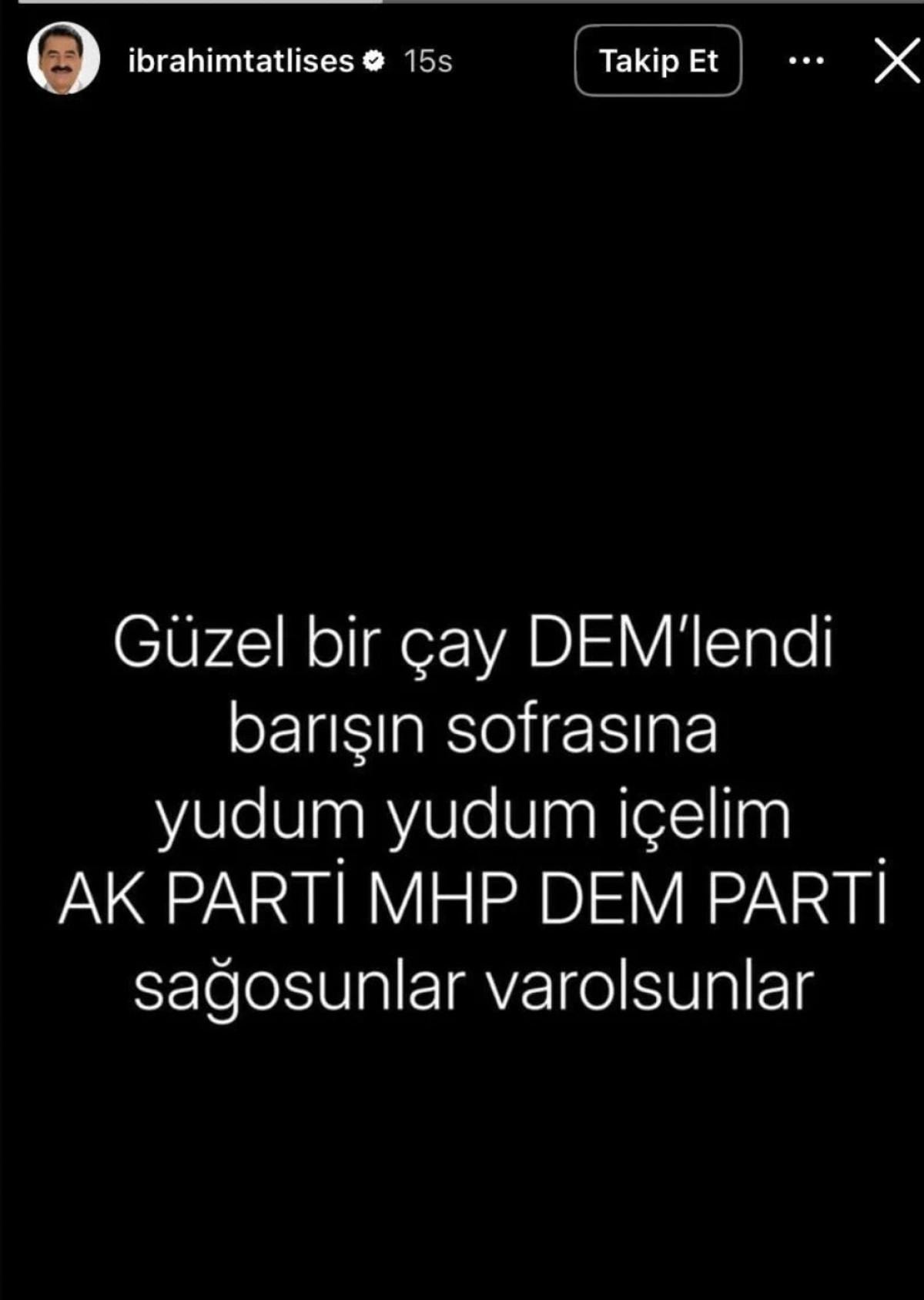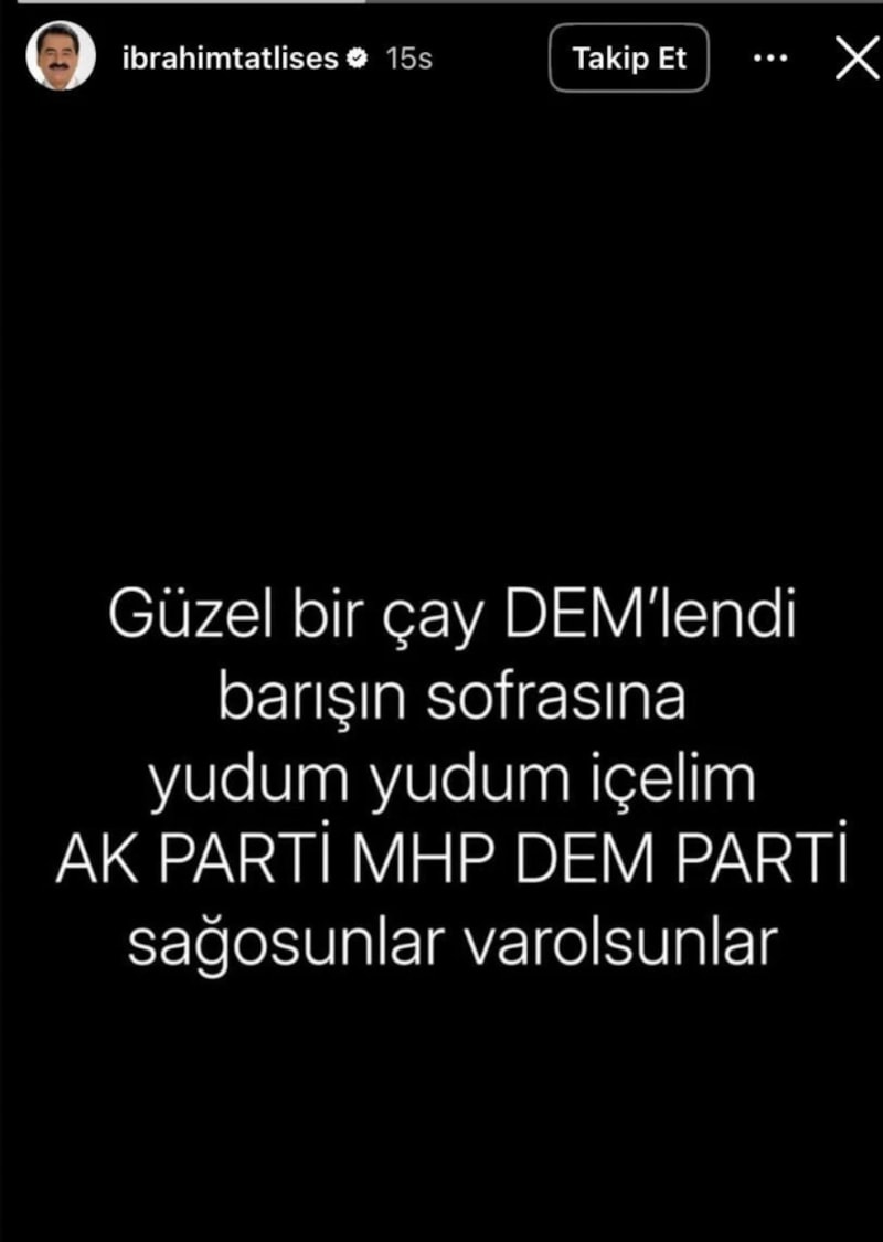 Cumhurbaşkanı Erdoğan'ın bu sözlerinin ardından İbrahim Tatlıses, sosyal medya hesabından; "Güzel bir çay DEM'lendi barışın sofrasına yudum yudum içelim. AK Parti, MHP, DEM Parti sağ olsunlar, var olsunlar." mesajını yayımladı.