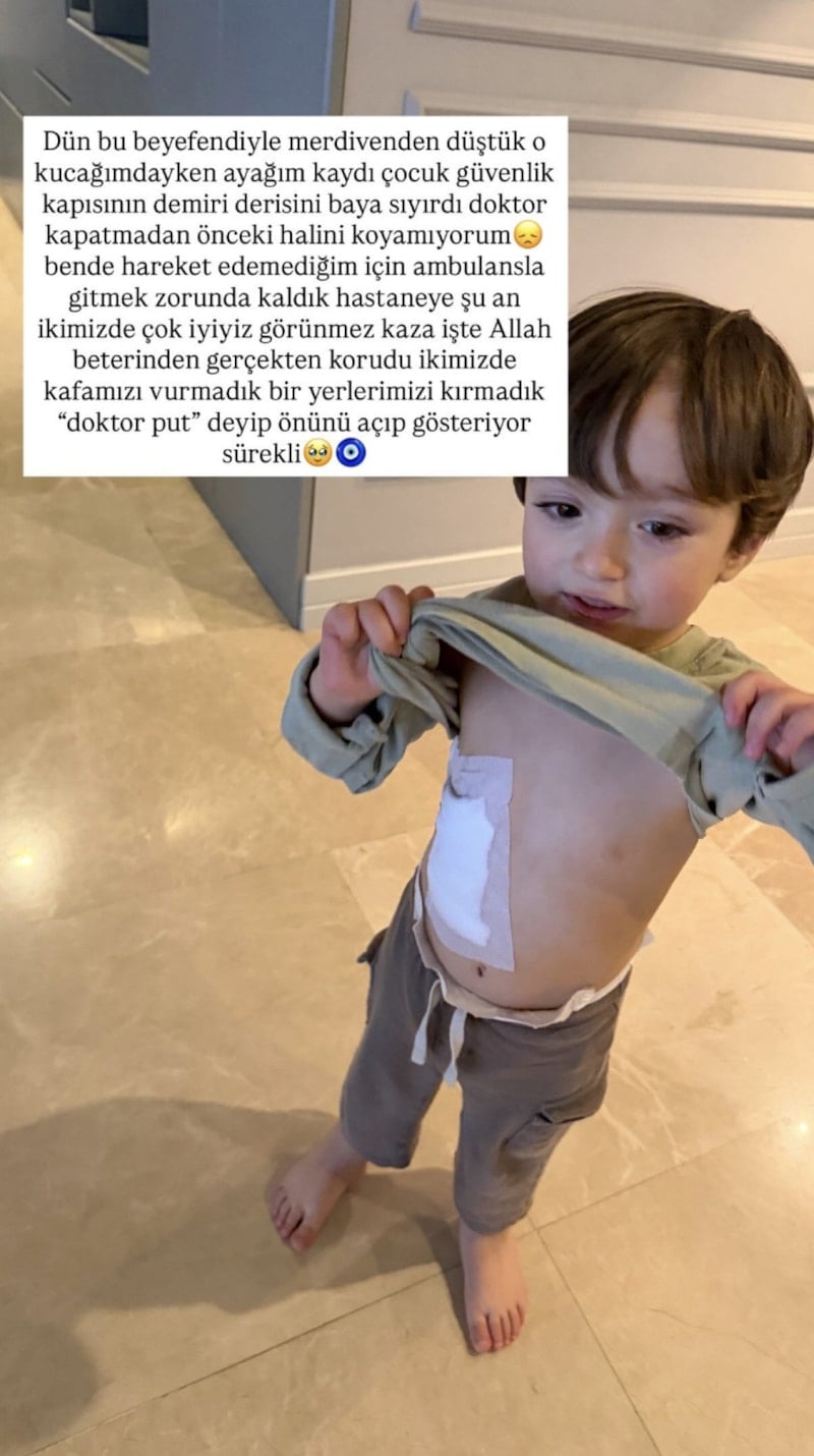 "Ayağım kayıp merdivenden düşünce çocuk güvenlik kapısının demiri Ayel'in karnının derisini bayağı sıyırdı. Ben de hareket edemeyince ambulansla hastaneye gitmek zorunda kaldık. İkimiz de çok iyiyiz. Görünmez kaza işte. Allah beterinden korudu gerçekten. İkimiz de kafamızı vurmadık, bir yerlerimizi kırmadık."