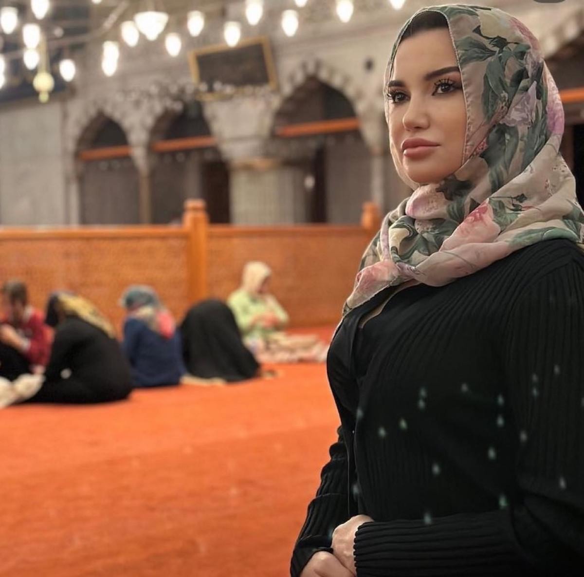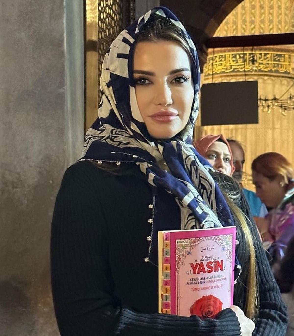 Kandil için Sultan Ahmet Camii’ne giden Ezmeci, buradan tesettürlü fotoğraflarını paylaştı.