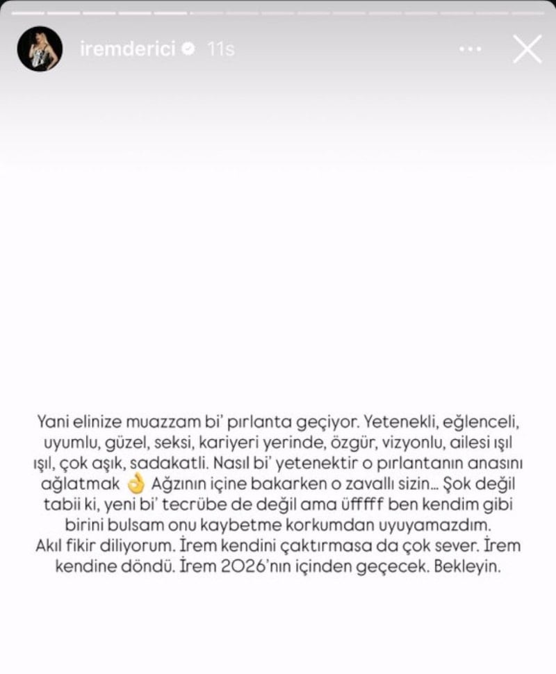 Derici paylaşımında, "Yani elinize muazzam bi' pırlanta geçiyor. Yetenekli, eğlenceli, uyumlu, güzel, seksi, kariyeri yerinde, özgür, vizyonlu, ailesi ışıl ışıl, çok aşık, sadakatli. Nasıl bi' yetenektir o pırlantanın anasını ağlatmak. Ağzının içine bakarken o zavallı sizin... Şok değil tabii ki, yeni bi' tecrübe de değil ama üfffff ben kendim gibi birini bulsam onu kaybetme korkumdan uyuyamazdım. Akıl fikir diliyorum. İrem kendini çaktırmasa da çok sever. İrem kendine döndü. İrem 2026'nın içinden geçecek. Bekleyin." ifadelerini kullandı.