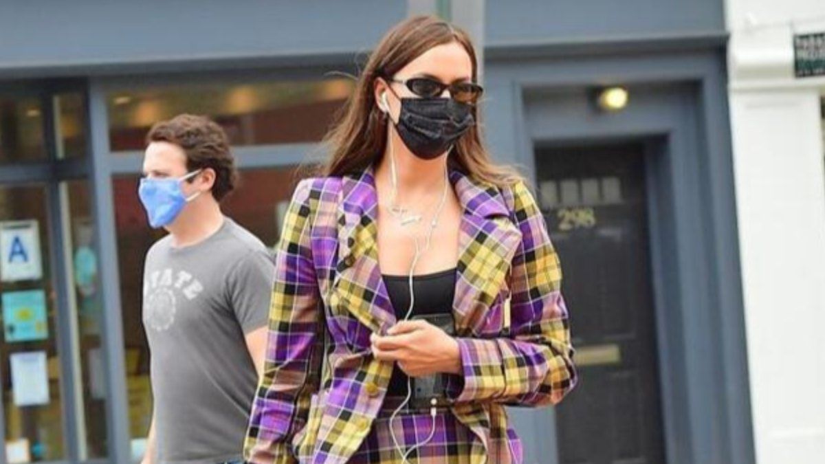 Vivienne Westwood tasarımı ekoseli ceket ve etek takımını diz altı çizmeleriyle eşleştiren Shayk, pandemi kurallarına uymayı da ihmal etmedi.