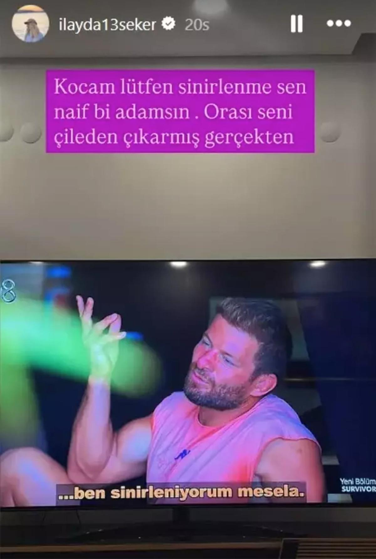 Survivor 2025, son bölümüyle 4 Mayıs akşamı ekrana geldi. Kritik dokunulmazlık oyunu oynanırken İlayda Şeker, eşi İsmail Balaban'ın parkurdaki bir görüntüsünü yayınladı. Şeker, eşinin fotoğraflarını peş peşe paylaşarak ''Kocam lütfen sinirlenme. Sen naif bir adamsın. Orası seni çileden çıkarmış gerçekten.'' notunu düştü. İlayda, sonraki gönderisinde ise 'Maşallah bir tanem' mesajını yazarak kalp emojisi koydu.