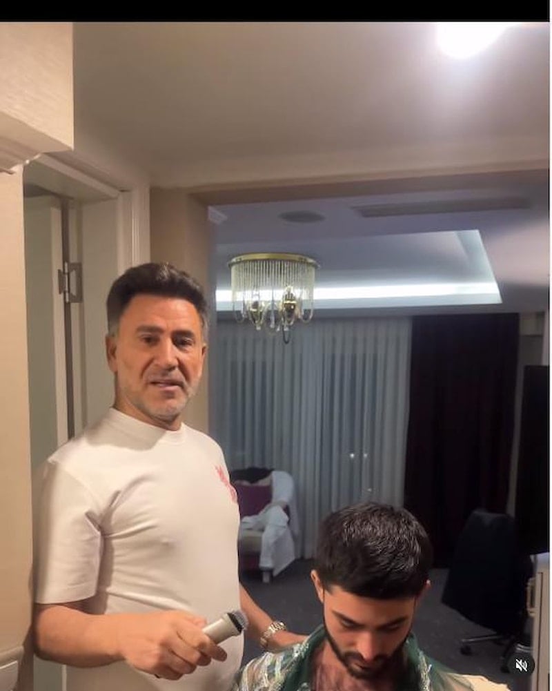 Sanatçı İzzet Yıldızhan, askere uğurladığı oğlunun saçlarını kesti.