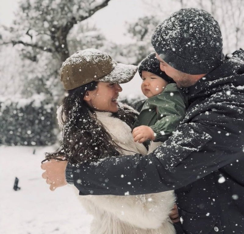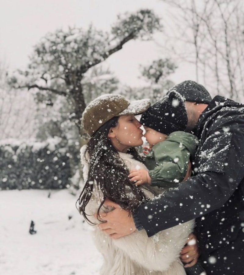 Oyuncu Kaan Yıldırım ve Pınar Deniz, 2026’nın karlı ilk gününde oğulları Fikret Hakan ile evlerinin bahçelerinde poz verdi.