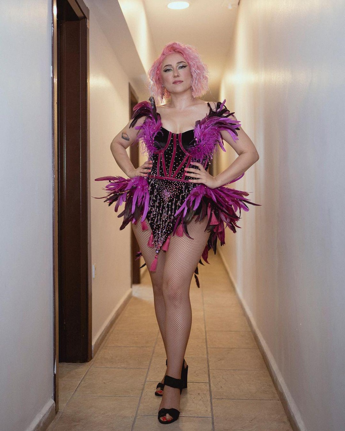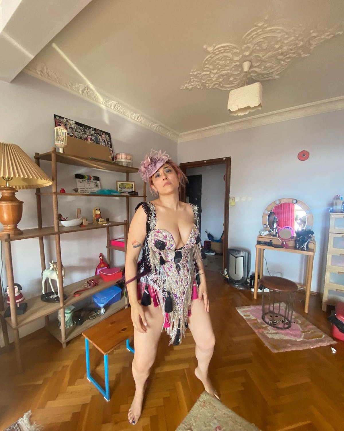 Evindeyken sahne kostümlerinden birini giyen Kalben, o haliyle verdiği pozu Instagram hesabından yayınladı.