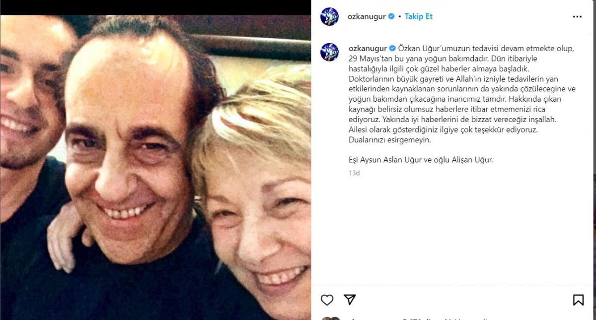 Özkan Uğur'umuzun tedavisi devam etmekte olup, 29 Mayıs'tan bu yana yoğun bakımdadır. Dün itibariyle hastalığıyla ilgili çok güzel haberler almaya başladık. Doktorlarının büyük gayreti ve Allah'ın izniyle, tedavilerin yan etkilerinden kaynaklanan sorunlarının da yakında çözüleceğine ve yoğun bakımdan çıkacağına inancımız tamdır. Hakkında çıkan kaynağı belirsiz olumsuz haberlere itibar etmemenizi rica ediyoruz. Yakında iyi haberlerini de bizzat vereceğiz inşallah. Ailesi olarak gösterdiğiniz ilgiye çok teşekkür ediyoruz. Dualarınızı esirgemeyin.
