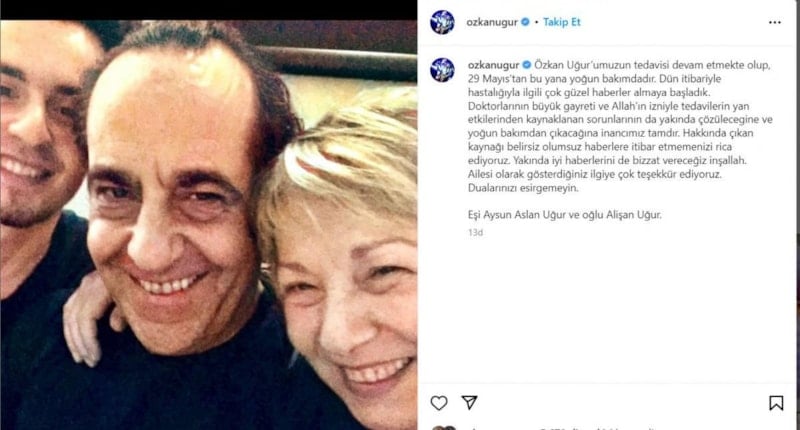 Tedavisi yoğun bakımda devam eden sanatçı Özkan Uğur'un ailesinden açıklama geldi. Açıklamada, “Uğur'un dün itibariyle hastalığıyla ilgili çok güzel haberler almaya başladık. Doktorlarının büyük gayreti ve Allah'ın izniyle yoğun bakımdan çıkacağına inancımız tamdır” denildi.