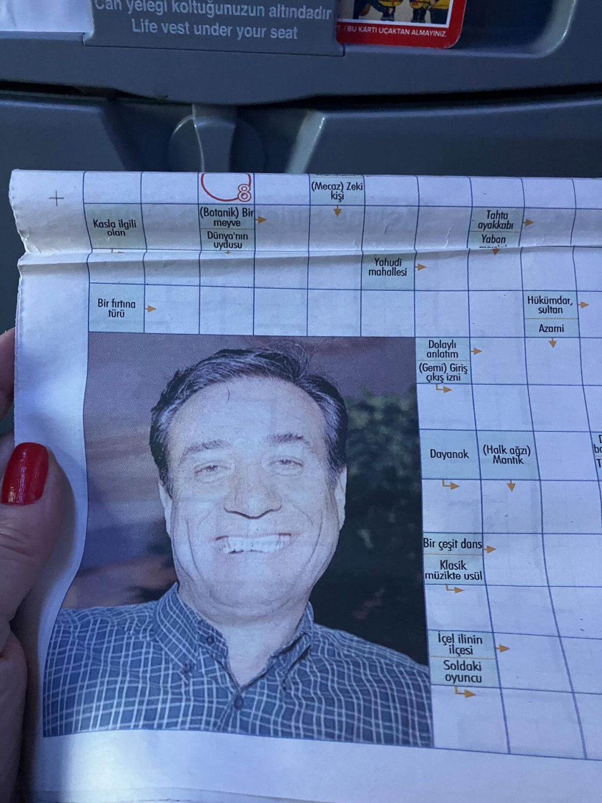 "Uçak yolculuğunda bilmece çözmekle oyalanıyorum. Bu defa gazeteyi açar açmaz sürprizle karşılaştım. Sanki Konya yolculuğunda berberiz değil mi Kemal?"